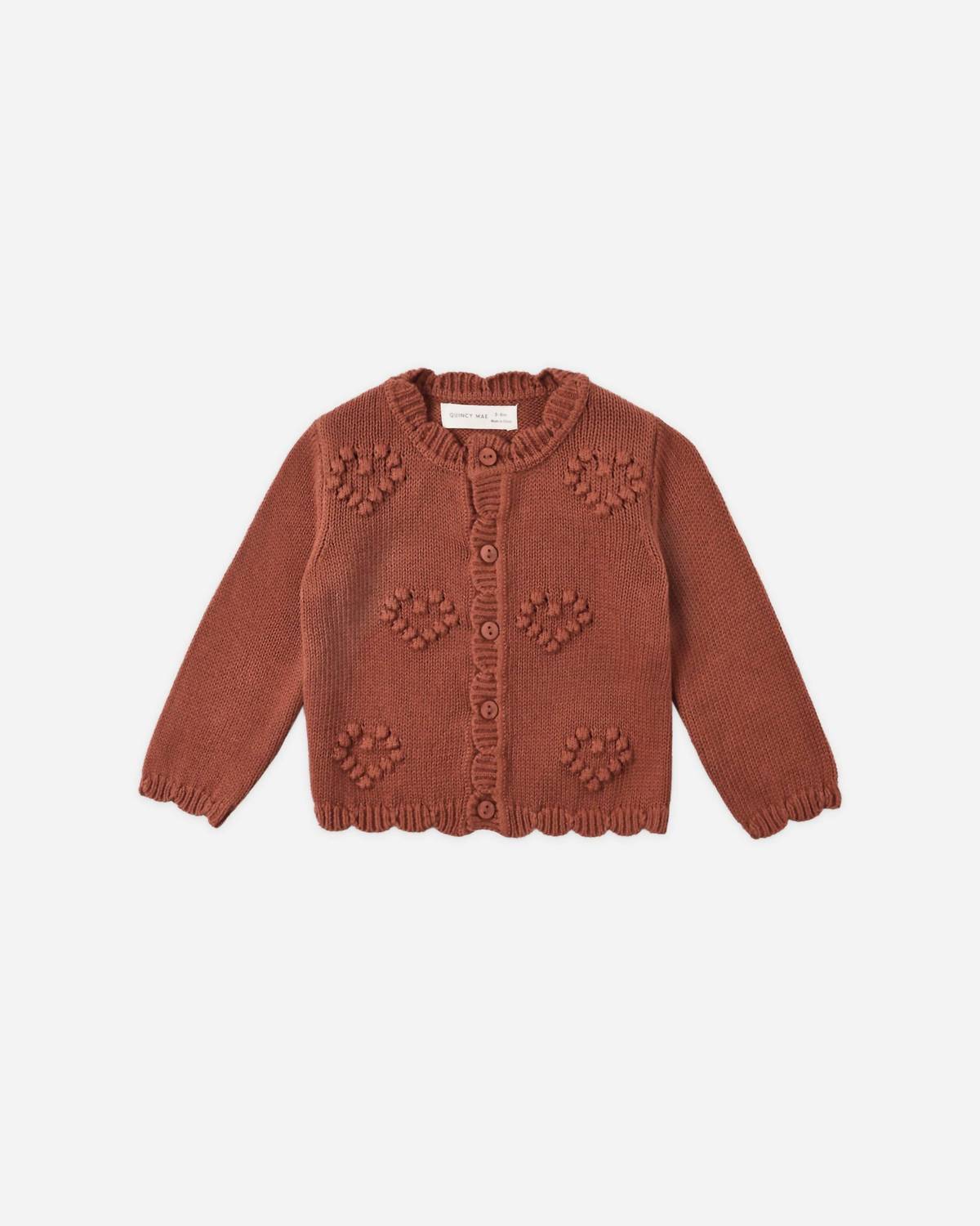 Meet the Kid's Knit Cardigan by Quincy Mae, a charming piece perfect for your little one's spring vacation wardrobe. This red cardigan boasts a delightful heart bobble knit and scalloped trim, accentuated with faux shell buttons. Crafted from 100% organic cotton, it's not only stylish but gentle on the skin. Care for this garment is simple: machine wash cold and lay flat to dry.