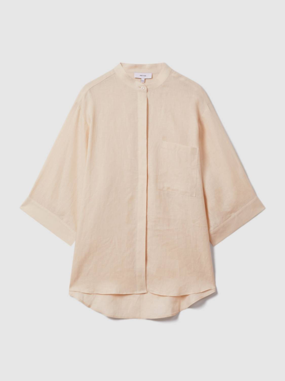 This button down shirt is comfortable yet polished. Discover the Winona Linen Button Down Shirt by Reiss, a minimalist piece perfect for your spring vacation wardrobe. This blush shirt features three-quarter relaxed sleeves and a grandad collar, complemented by a split high-low hemline for added style. Crafted from 100% linen, it boasts a natural look and texture. Closure: Button-front closure. Care: Machine washable.