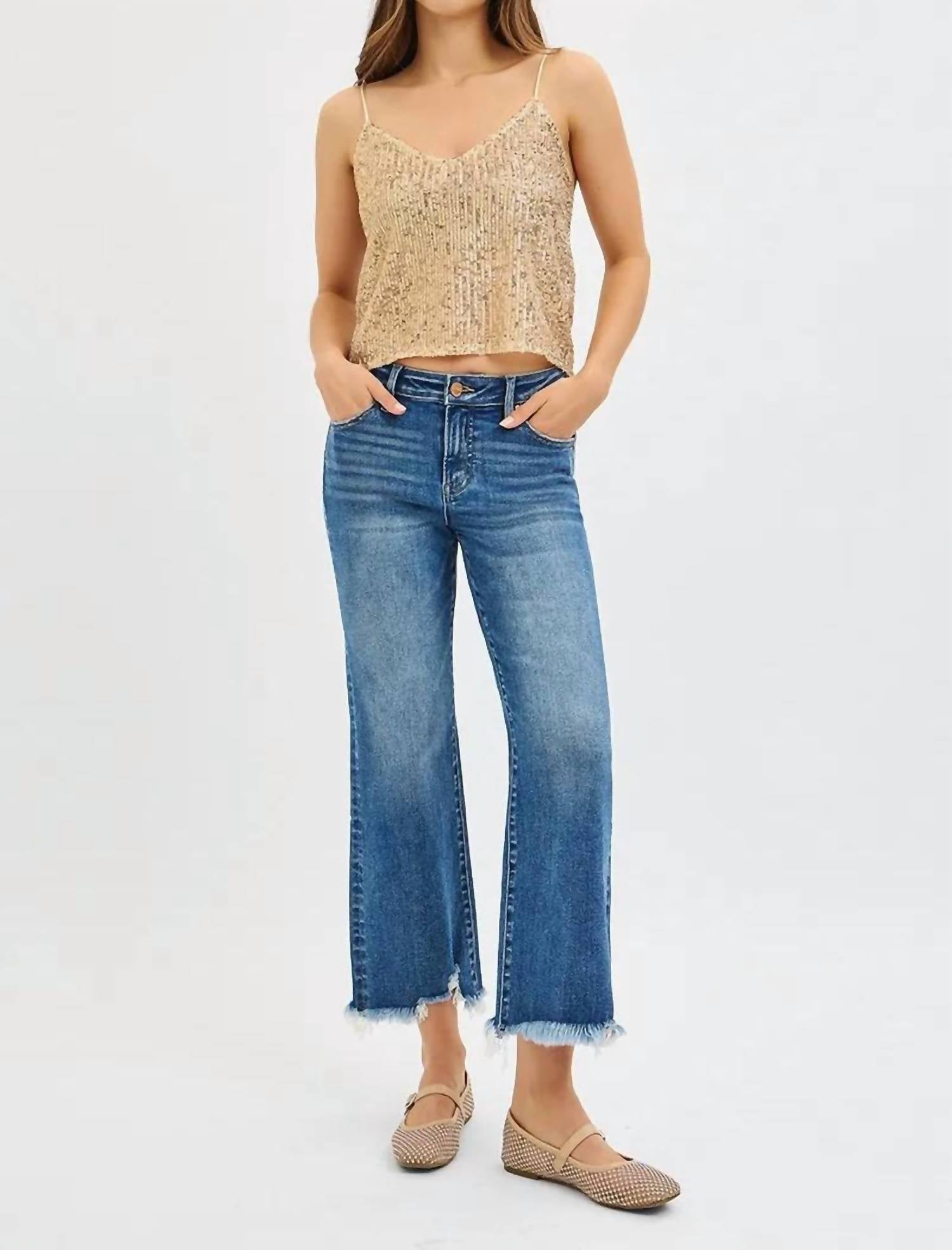 Pair these straight leg jeans with flats, sandals or even heels! You can't go wrong. Elevate your denim wardrobe with the Tatum Mid Rise Crop Straight Jeans in a classic Medium Blue Wash by RISEN. These jeans feature a relaxed fit with a flattering mid-rise, wide leg cut, and cropped ankle length with a raw frayed hem for a touch of modern style. Crafted from a premium cotton blend consisting of 96% cotton, 2% polyester, and 2% spandex, they offer slight stretch for comfort. Designed for versatile styling, they are finished with a button closure and can be machine washed and tumble dried.