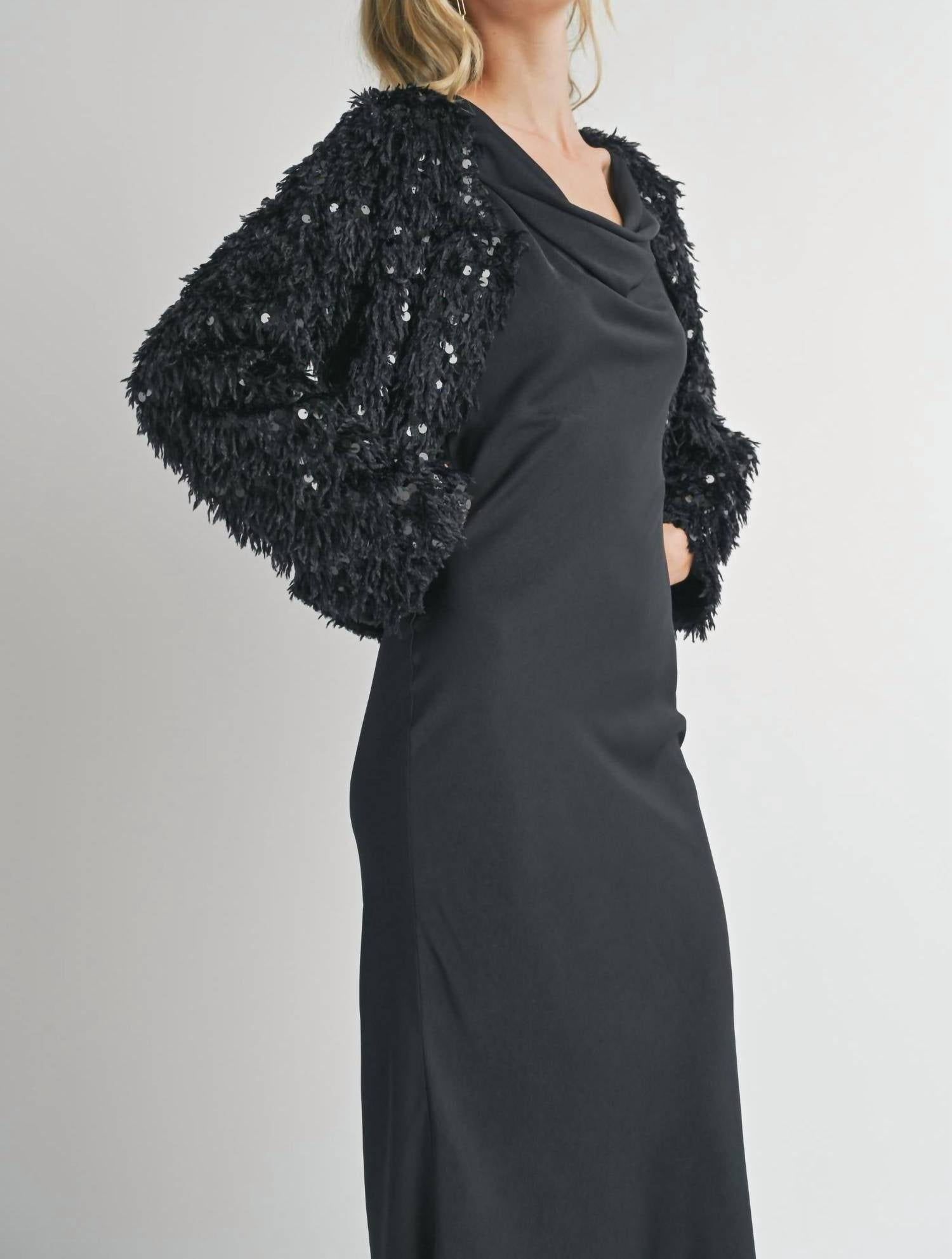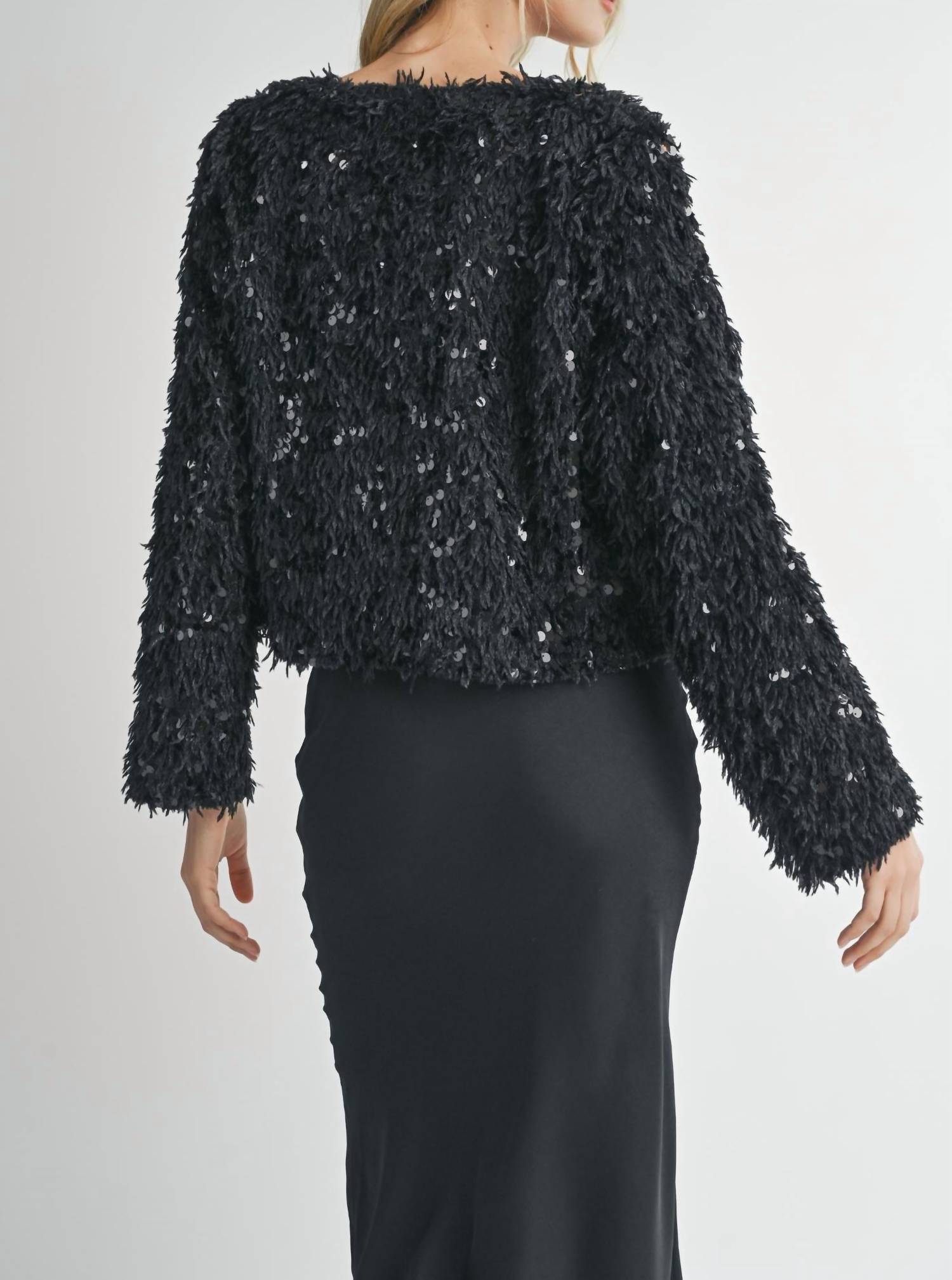 A casual yet cool jacket that every closset needs. Introducing the Faux Fur and Sequin Jacket by Sadie & Sage, a stylish choice for a dinner party or New Year's Eve celebration. This women's jacket in textured black features long sleeves and a V-neckline, crafted from 100% polyester for a luxurious feel. Designed without pockets, it embodies the trend of quiet luxury, making it perfect for fall occasions.
