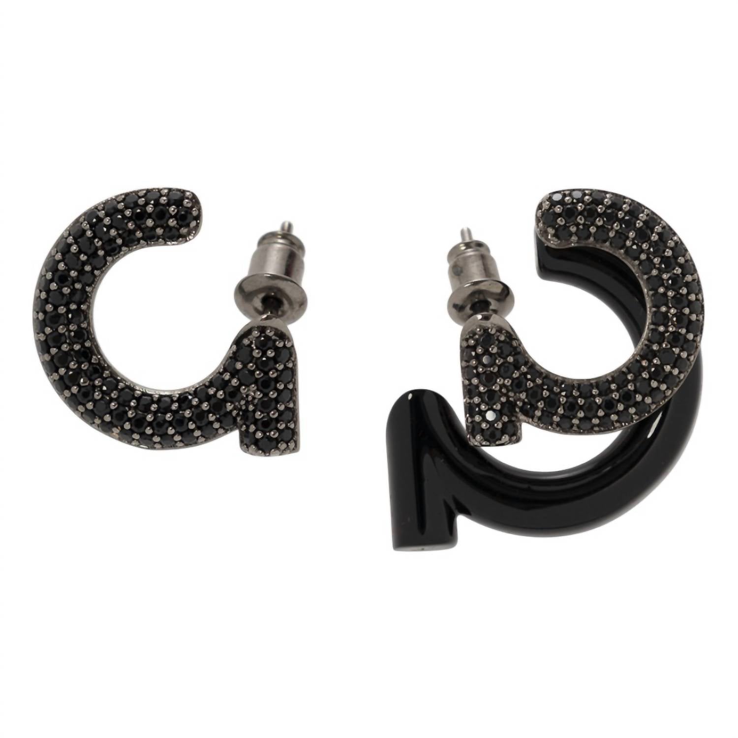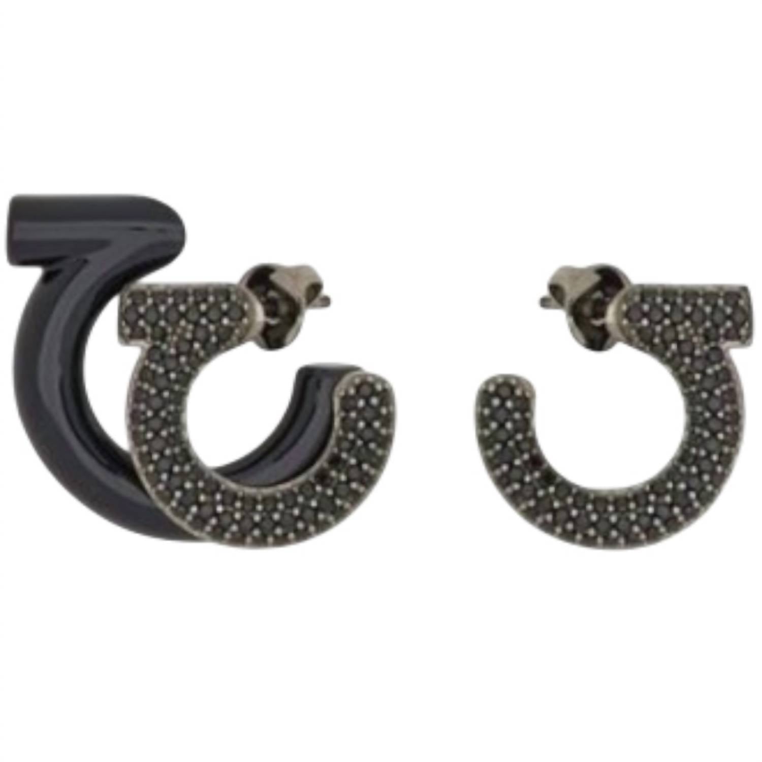 Easy and elegant earrings to complement any outfit. Elevate your accessory game with the Women's Gancini Logo Earrings by Salvatore Ferragamo, a stunning blend of black and silver-tone elegance. Crafted from brass and enhanced with crystals, these earrings offer an exquisite touch of glamour. They feature a convenient post clasp for secure wear. Please note the intricate combination of materials including glass and silver plating for a distinct and sophisticated look.