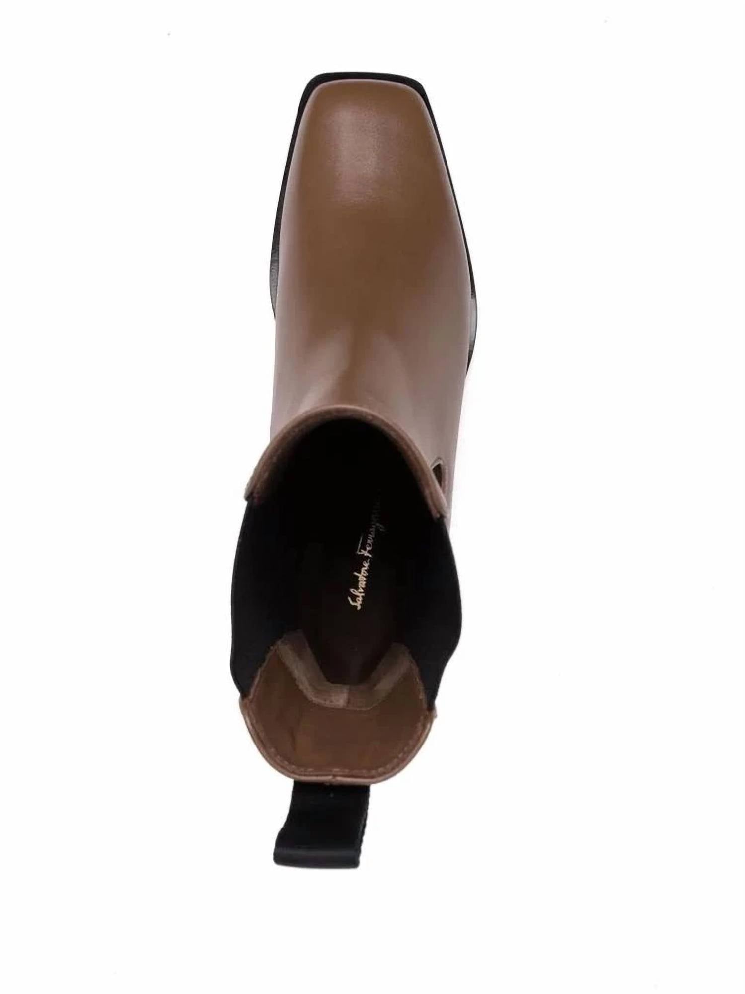 Say hello to the perfect, most versatile boot. The ankle height makes this style easily transition from day to night. Wear them with your favorite skinny jeans and tee for a more laid back look, or pair them with your favorite mini dress and jacket for a night out on the town. Step into elegance with the Women's Wedged Leather Ankle Boots by Salvatore Ferragamo, crafted in Italy from exquisite tan brown calf leather. These ankle boots feature a stylish wedge heel with an approachable height of 1.77 inches, offering both comfort and sophistication for evening events or New Year's Eve celebrations. The design includes a gold-tone logo plaque, branded insole, elasticated side panels, and a square toe with a pull-tab for easy slip-on convenience. The rubber outsole ensures a durable finish, embodying the quiet luxury trend for the fall season.