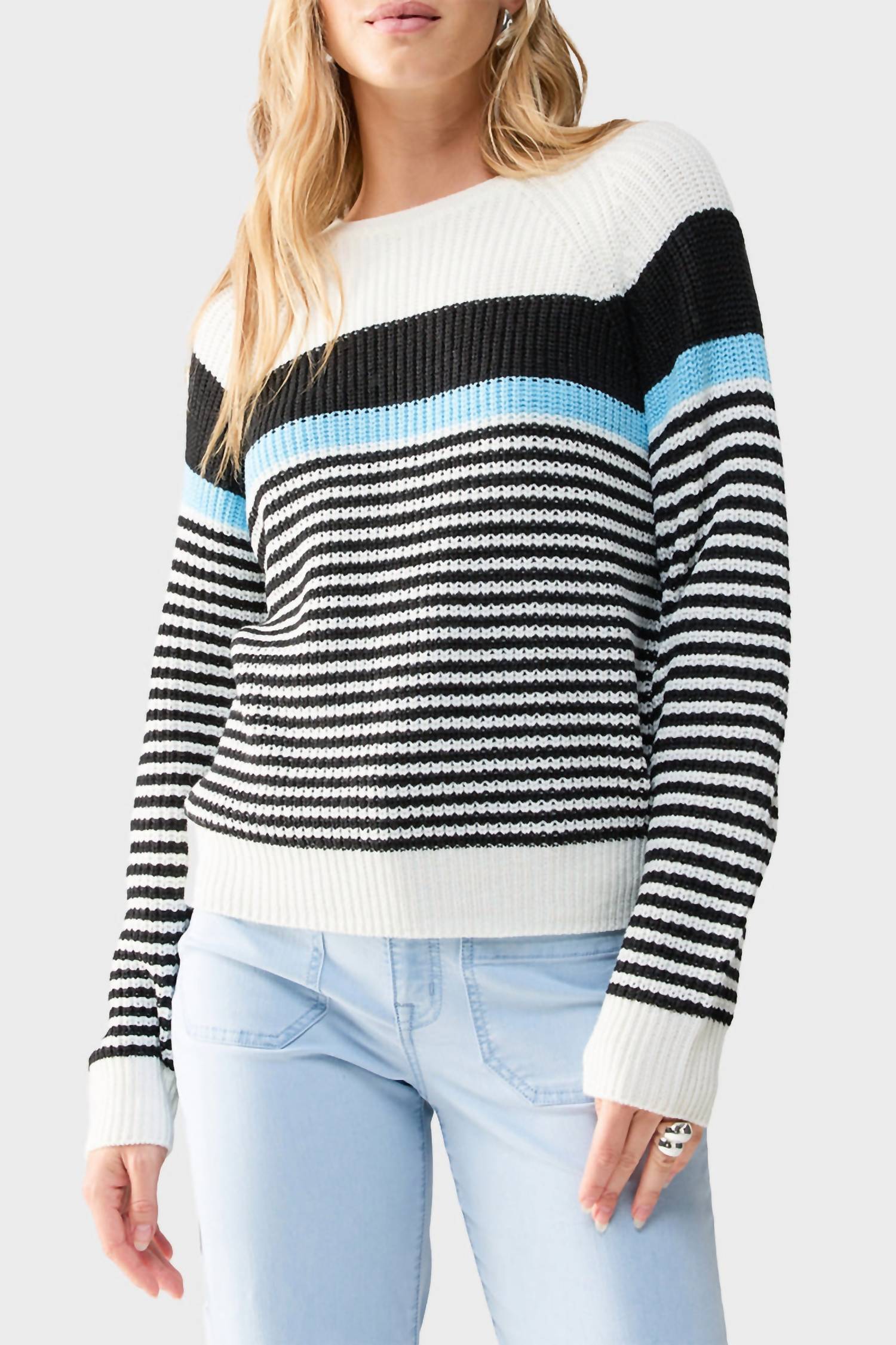 The ultimate go-to sweater, expertly crafted to provide the perfect combination of warmth and style. Its classic design and soft fabric make it a must-have addition to your wardrobe. Elevate your fall wardrobe with the Sanctuary Summit Sweater in Sky Blue Stripe. This women's crewneck features long sleeves and a relaxed fit that delivers both comfort and effortless style, perfect for vacation getaways. Made from 100% polyester, it measures 21 inches in length and is designed with pull-on closure for ease. Care instructions include machine wash cold and dry flat.