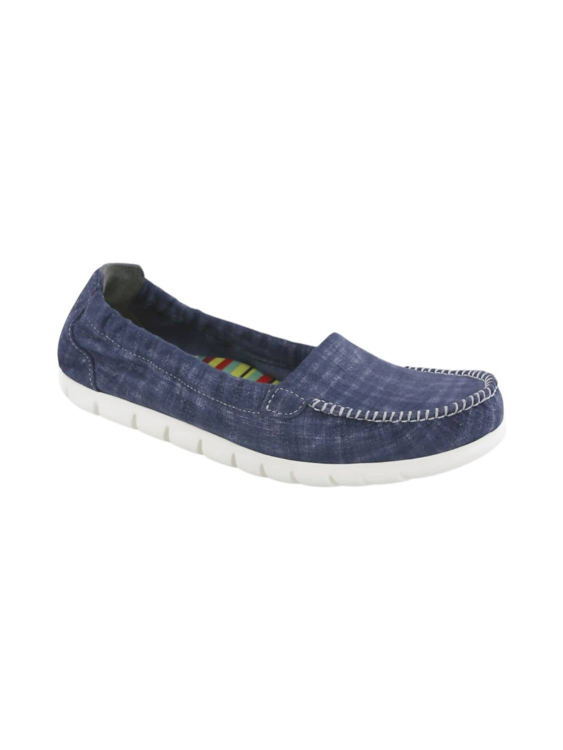 Loafers so versatile you can wear them with just about anything. Introducing the Women's Sunny Slip On Loafer by SAS, a stylish and comfortable choice in sophisticated Blue Jay. Crafted from soft tumbled leather, this loafer features a genuine moccasin construction and an elasticized topline for a snug fit. The EVA superlight sole offers exceptional flexibility with its multi-flex groove design, complemented by the removable SAS Tripad® Technology cushioned footbed for all-day shock absorption. Enjoy a heel height of 0.75" and the convenience of a removable footbed, making it an ideal everyday companion.