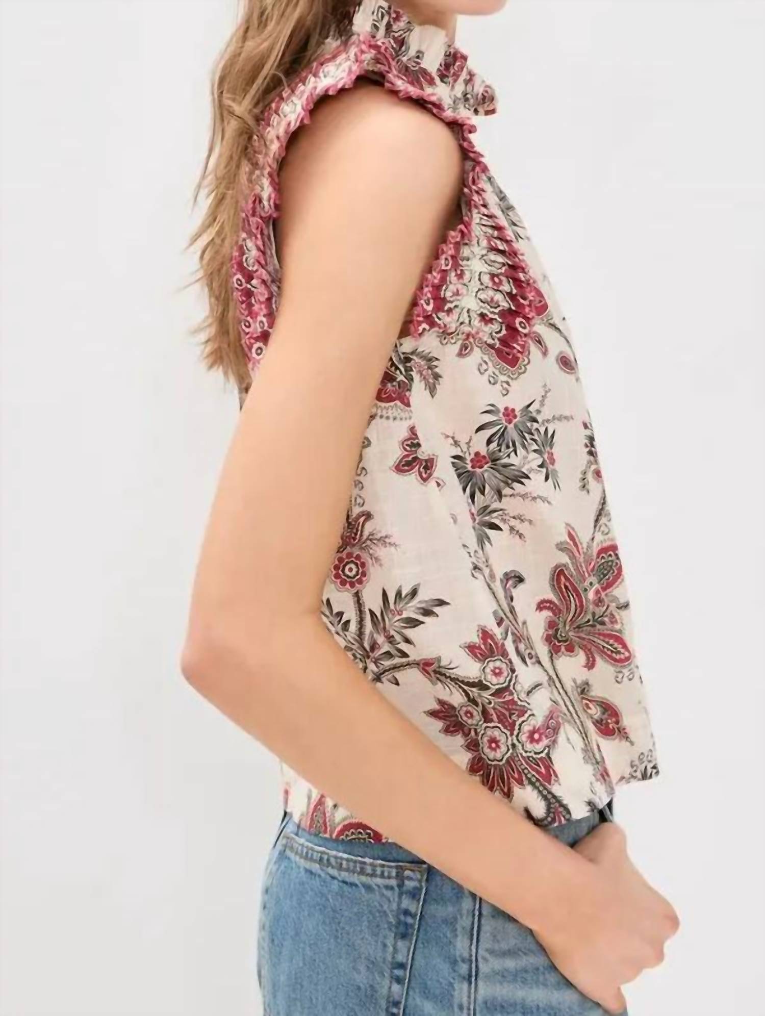 Pair this with your favorite jeans and slides for your next girls night out. Introducing the Cassandra Flutter Sleeve Top by SEA, a statement piece in cream and red perfect for your Boho Chic fall looks. This sleeveless blouse features a lightweight, non-stretch cotton weave with pintuck detailing, crochet trim, and a floral paisley pattern. The design includes flattering ruffle edges, a mockneck, and a button keyhole closure at the back. Measurement from size XS is 21.75in / 55.0cm from shoulder, making it an exquisite choice for holiday parties like Easter.