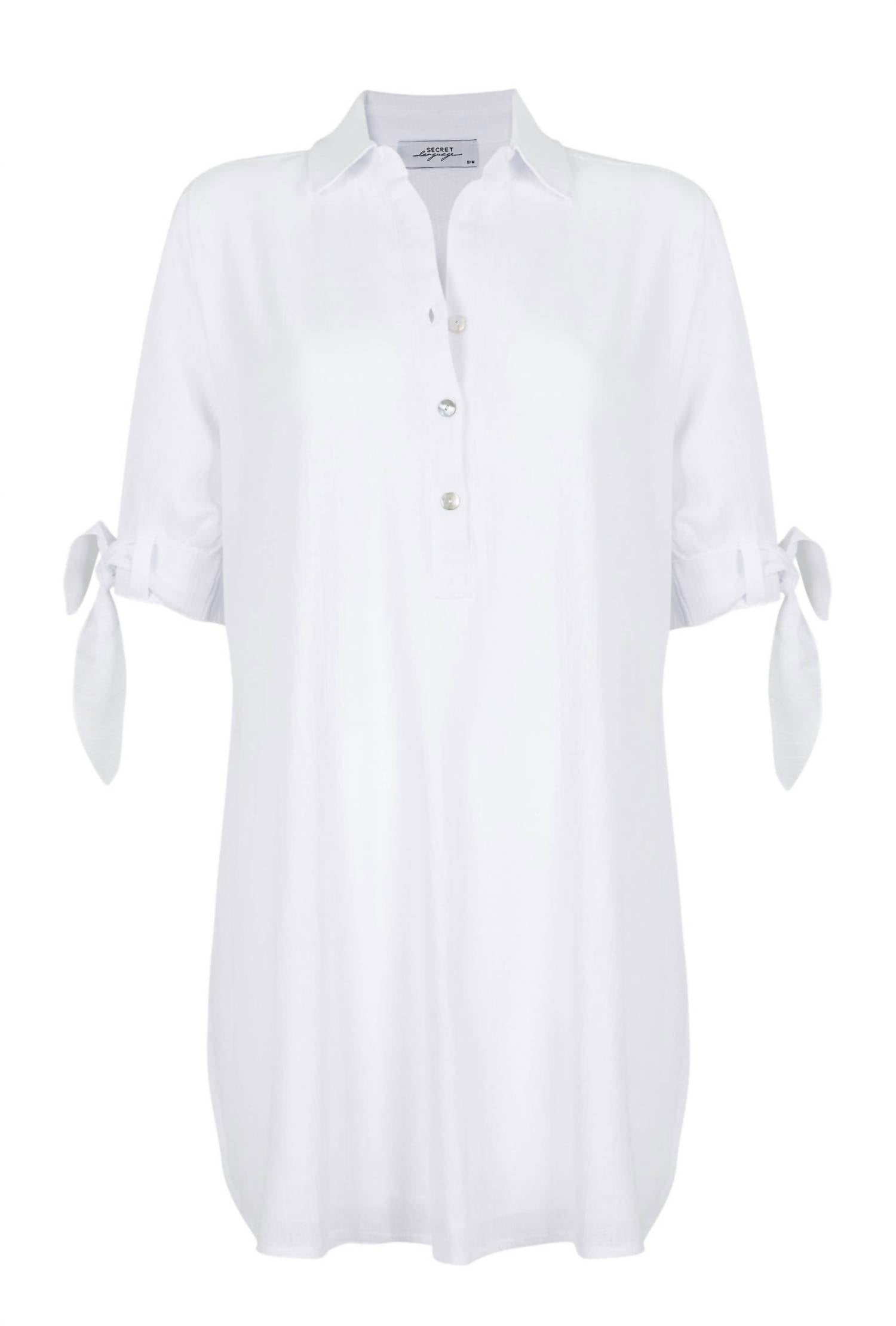 The kind of easy and flattering dress you'll be reaching for all season long. Introducing the Sherv Tunic Mini Dress by Secret Language, a chic choice for your spring holiday parties, including Thanksgiving. This elegant minimalist piece in crisp white offers short sleeves with adjustable ties and a stylish button closure. Made from 100% lightweight cotton, it's designed to flutter gracefully in a warm breeze. Proudly made in Turkey, it promises comfort and style. Machine wash cold is suggested for care.