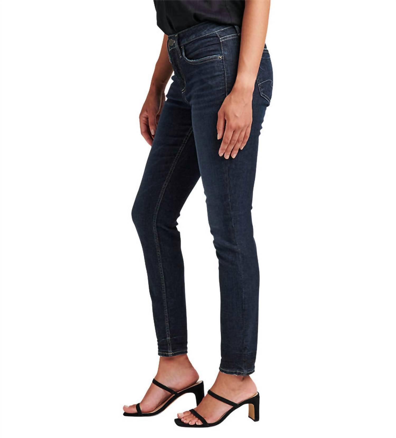 A skinny jean that is both flatering and comfortable. We love this style because it works great with boots, or without! Discover the High Rise Skinny Jean by Silver Jeans Co, a perfect addition to your wardrobe for that sleek and stylish look. These jeans feature a high-rise waist of 9.5 inches and a slim fit through the hip and thigh, crafted in a solid dark wash for a classic appeal. The contoured waistband ensures a no-gap fit, while the skinny leg and button closure provide a secure and flattering silhouette. Care instructions: Machine wash. Pockets included for convenience, making it ideal for spring holiday parties.