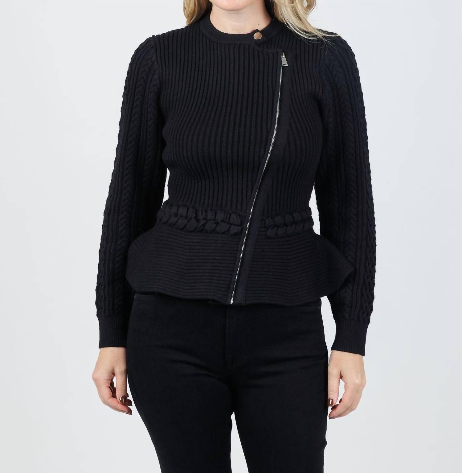 Cute, casual, and comfortable. This jacket is a must have. Elevate your fall wardrobe with the Signature Andi Peplum Jacket by Simkhai, designed for stylish holiday parties. This women's casual jacket features a moto-inspired zip closure and a mockneck, perfectly combining edgy and feminine elements. Made from a cotton and wool blend, it offers a fisherman knit texture and a flattering braided peplum waistline. Enjoy the comfort and style of this long-sleeve statement piece in classic black, ideal for making an impression. Model Cassie is wearing a size S (5'6" height, 32" bust, 28.5" waist, 31" hip, 29" inseam).