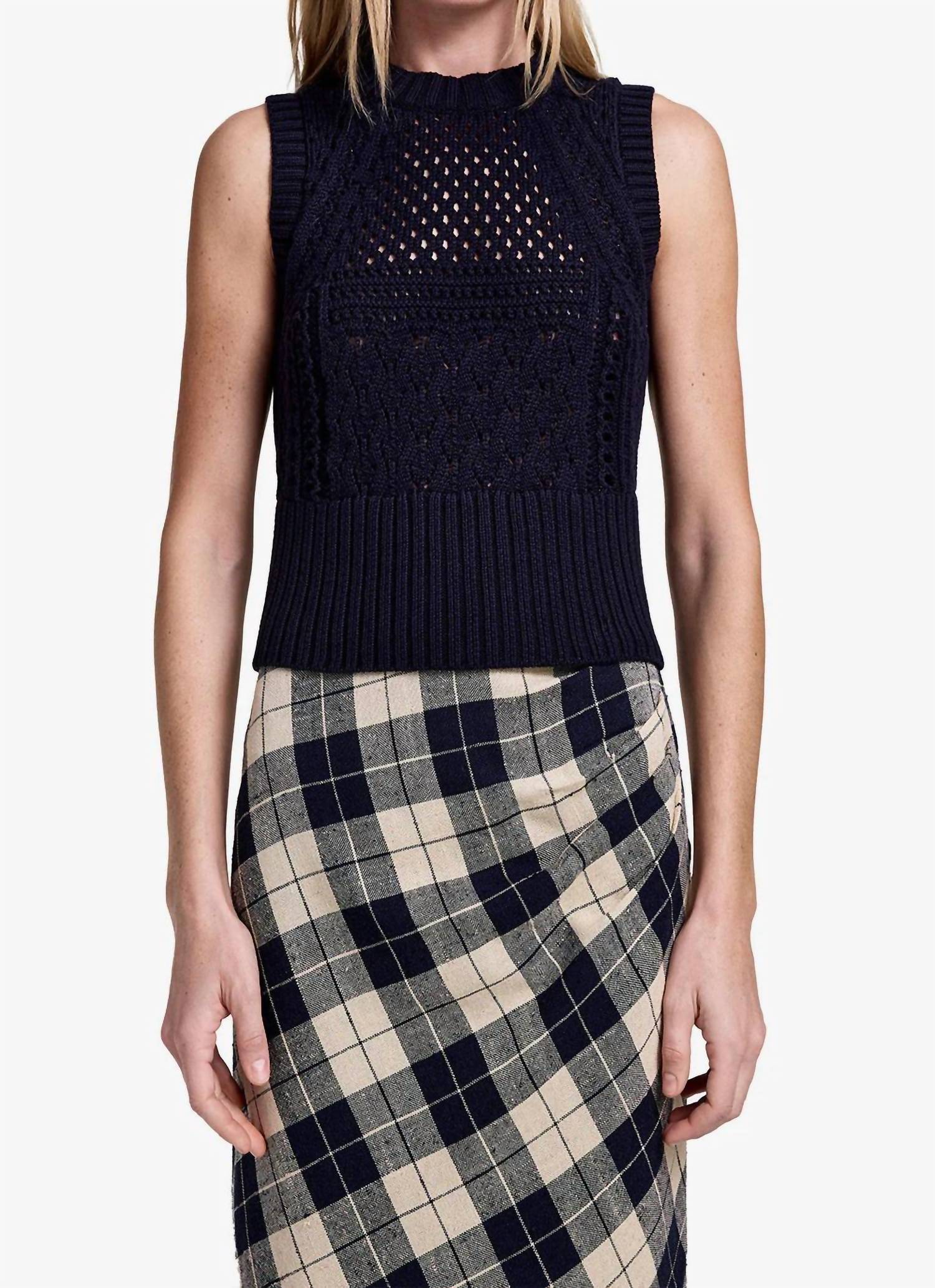 That extra layering piece you didn't know you needed! Presenting the Crochet Vest by Smythe, a stylish addition to any wardrobe in classic navy. This sleeveless vest is crafted from 100% cotton, showcasing a textured crochet stitching with an extra wide hem rib, perfect for layering or wearing on its own. The vest is cropped with a crewneck, ending at the hip, and features a pull-on closure for easy wear. For care, hand wash cold with mild detergent and lay flat to dry, ensuring the garment retains its shape and quality. Model is 5'9" and is wearing a size Extra Small.