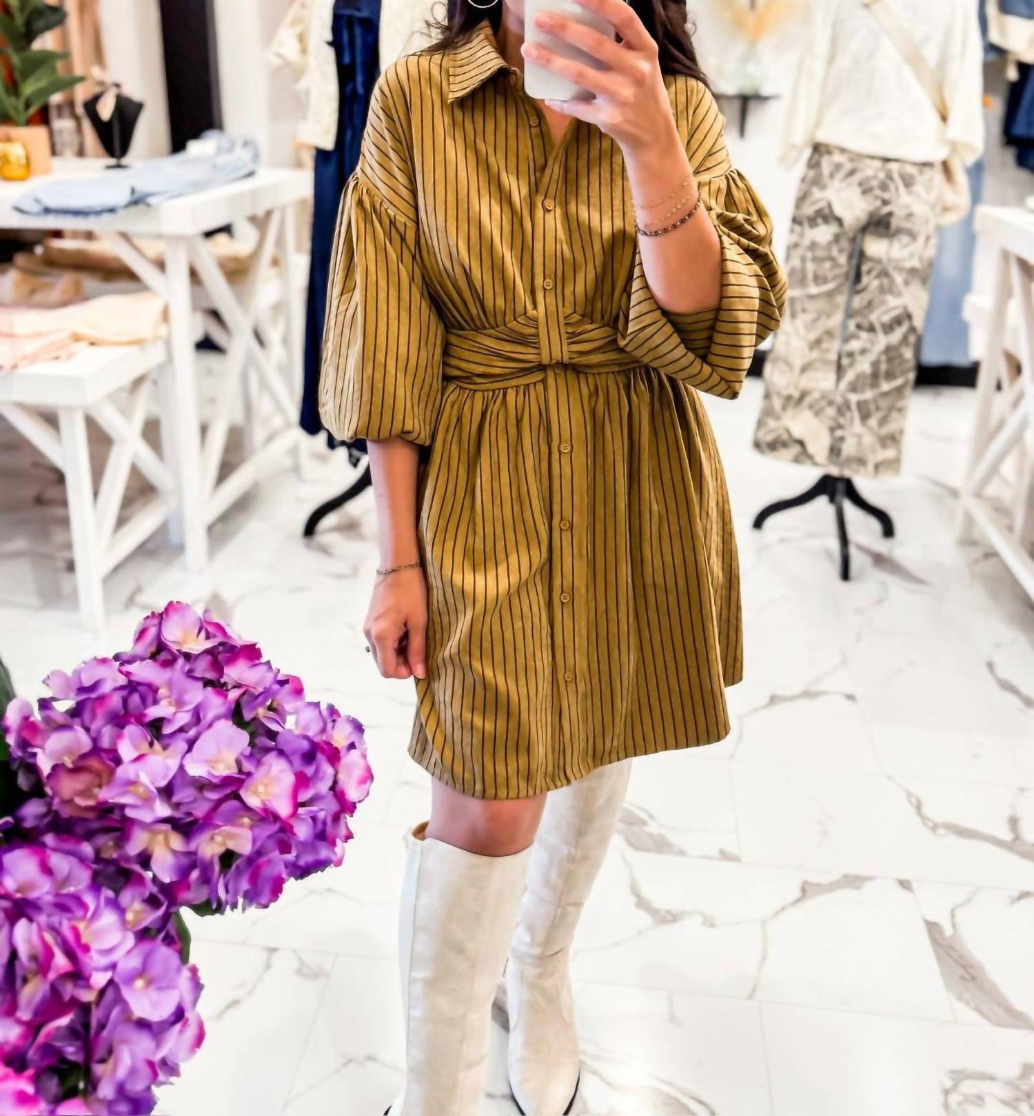 Cute and comfortable, this long sleeve dress has it all. The Women's Queue Me In Striped Mini Dress by Sunday Edition is a must-have for a versatile wardrobe addition. Crafted from 90% polyester and 10% cotton faux suede, this long sleeve dress features a structured top, making it feel tailored and chic. The piece boasts a collar neckline, enclosed button closure, and a flattering empire waist for a sleek fit. Perfect for any occasion, this brown striped dress can be dressed up or down, with sizes ranging from small (2-4) to large (10-12).