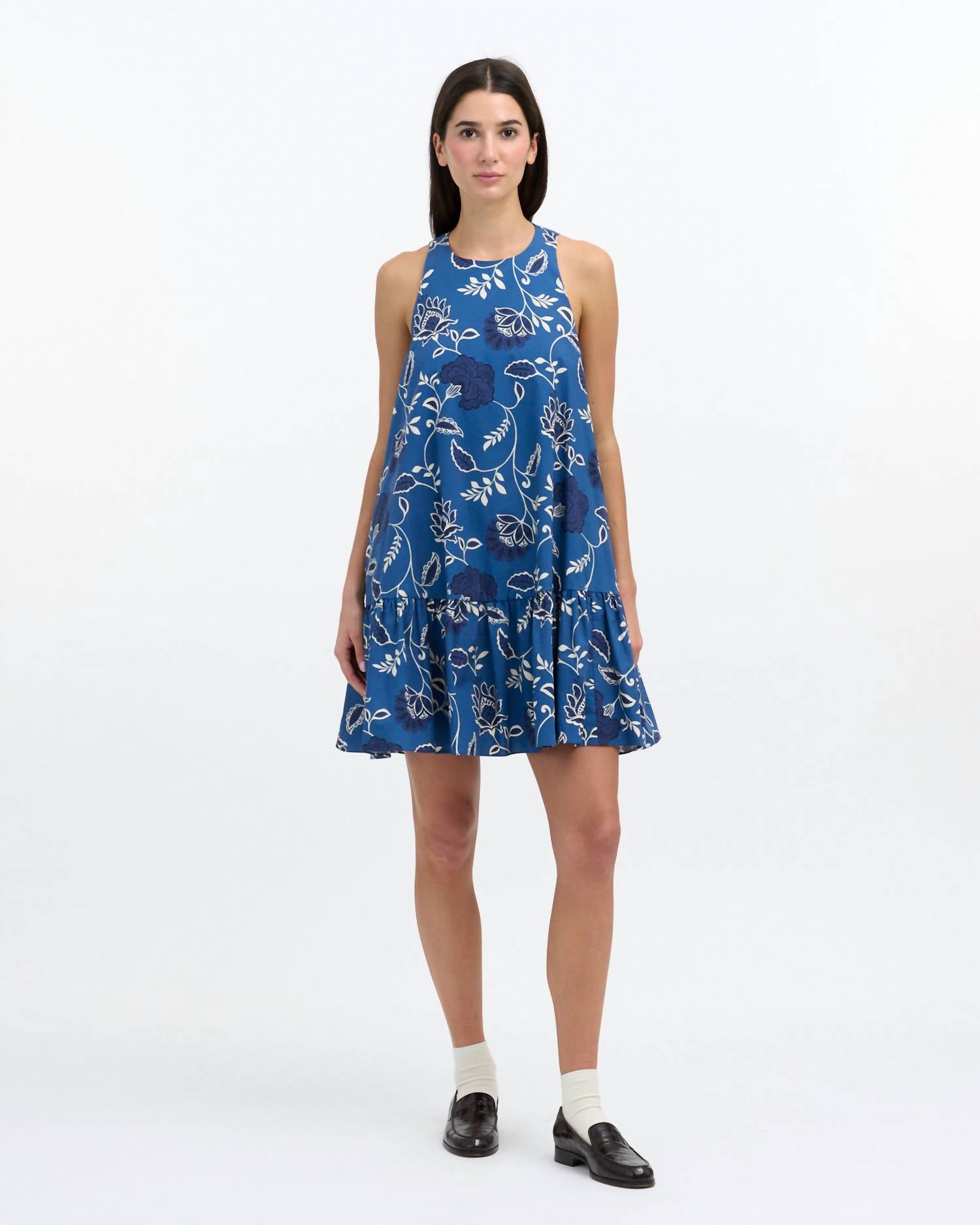 A short and breezy dress for those warmer days. Elevate your summer wardrobe with the Jessie Mini Dress by Tanya Taylor, showcasing a sleeveless, halter short style in enchanting French Blue and Cream. Made from 100% cotton, this playful floral babydoll design combines whimsical charm with a fit-and-flare silhouette, ideal for holiday parties like the 4th of July. The dress features a convenient pull-on closure, along with practical pockets. Care for this piece by machine washing and line drying to maintain its quiet luxury appeal.
