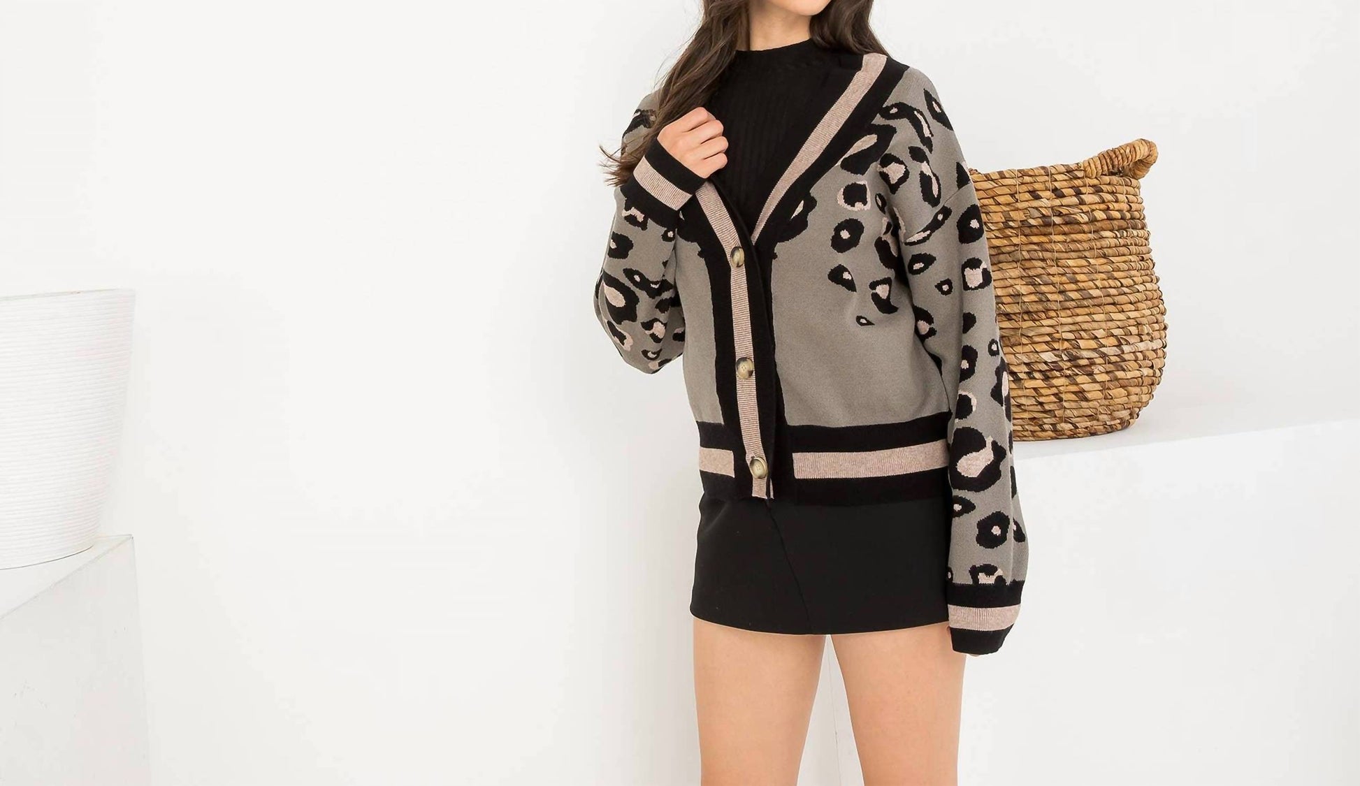 Throw this adorable cardigan over any cami or tank top. Introducing the Cheetah Knit Cardigan by THML, a stylish piece perfect for dinner parties or minimalist spring occasions. This long sleeve cardigan features an animal pattern in a chic beige, crafted from a knit fabric blend of 55% Viscose, 28% Polyester, and 17% Nylon. The design includes a practical button closure and a flattering V-neckline. Style measurements for a size S are Body Length: 22 1/8 inches, Bust Width: 42 inches, Sleeve Length: 20 1/4 inches.