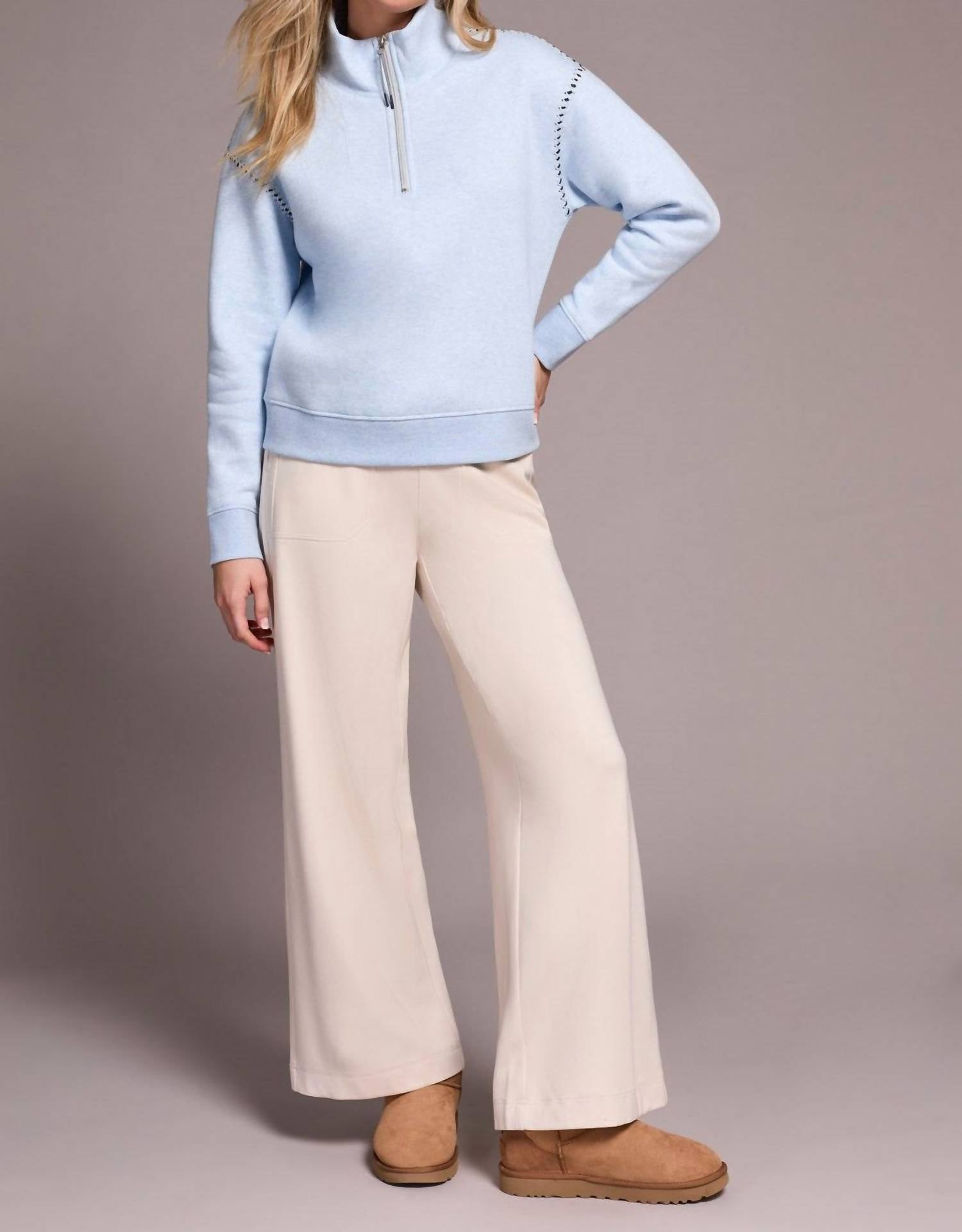 Layer under your favorite sweater or wear tucked into jeans for a perfectly polished winter look. Discover the TRIBAL Zip Funnel Neck Sweater in Chambray, a chic addition to your fall wardrobe. Designed with a cozy funnel neck and long sleeves, this piece offers a sleek and comfortable fit in a brushed back French terry fabric. The sweater is composed of a cotton blend with 59% Cotton and 41% Polyester, adding durability and softness. Closure: Half-length zip. Care: Machine wash and tumble dry, making it perfect for effortless everyday wear.