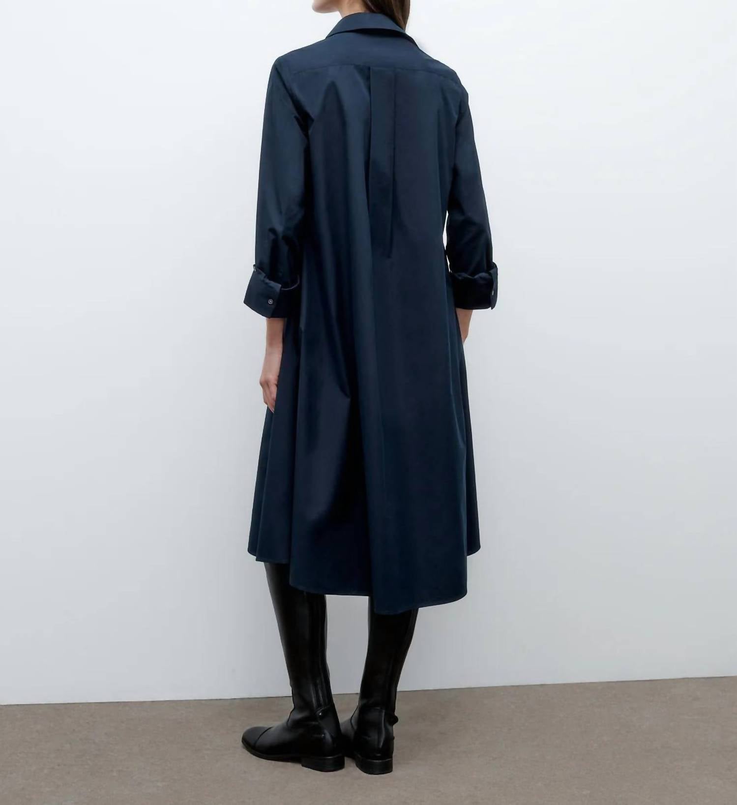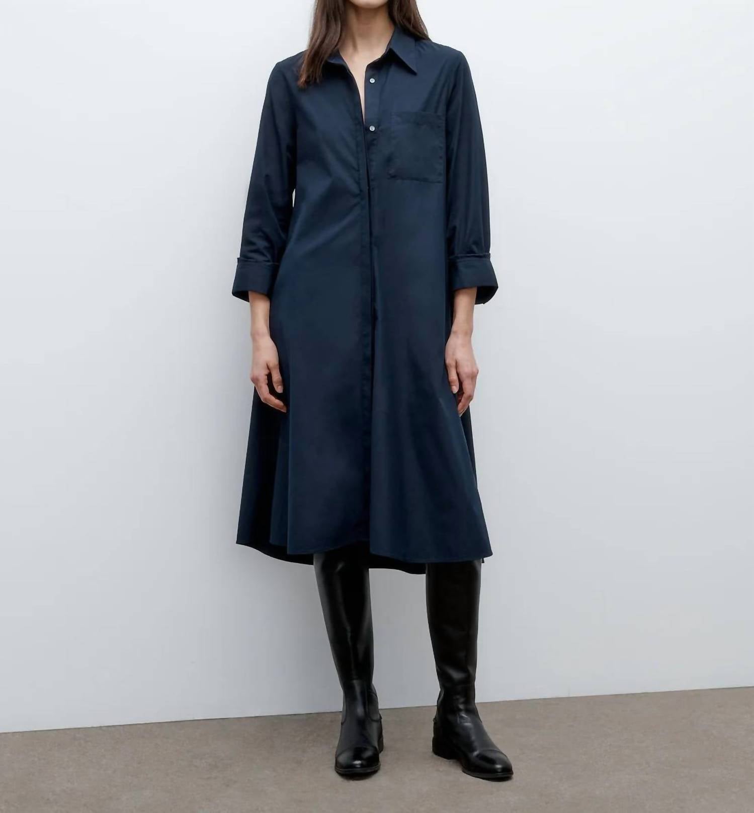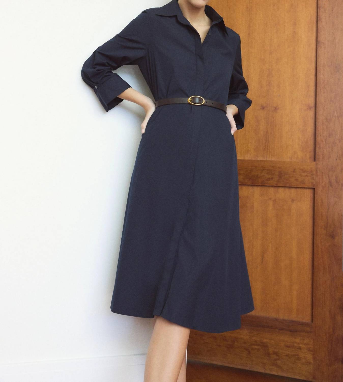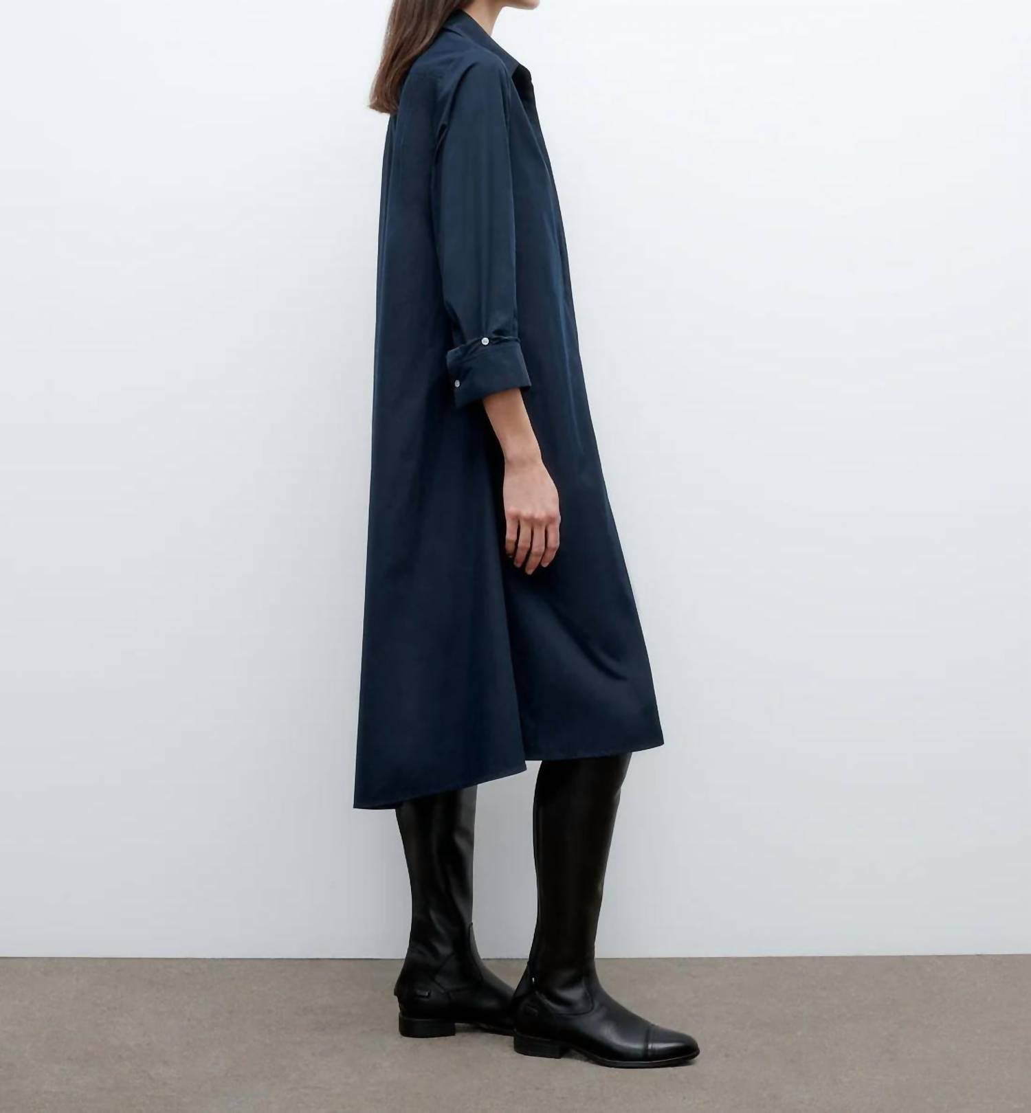 Just add slides or mules and you are good to go. Introducing the Handkerchief Midi Jenny's Gown by TWP, a chic addition in a solid Midnight tone. This women's shirt dress boasts long sleeves and showcases a relaxed, loose midi silhouette crafted from 100% cotton for a smooth, crisp feel. Designed with a concealed button closure, it features a chest patch pocket and is finished with a collar and wide button cuffs for added sophistication. While specific care instructions are not provided, this timeless piece is perfect for spring fashion.