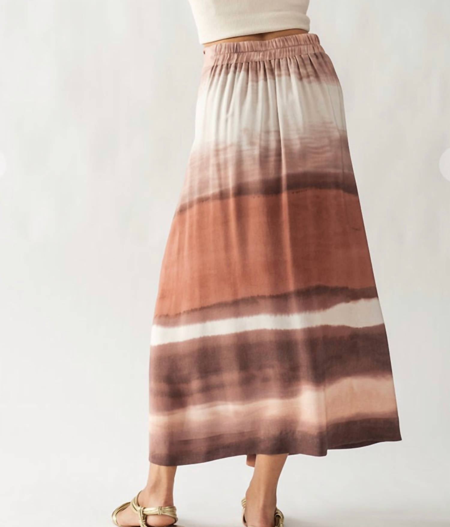 Show off just the right amount of skin in this beautifuly designed midi length skirt. Discover the Tie Dye Midi Skirt by Urban Daizy, designed for a standout look with its earth-toned gradient tie-dye print. This rust-colored skirt features a flattering twist at the waist and a versatile mid-length silhouette. Closure: Tie closure. Perfect for summer vacations or festive occasions, this skirt embodies the Boho Chic trend and offers all-day comfort.