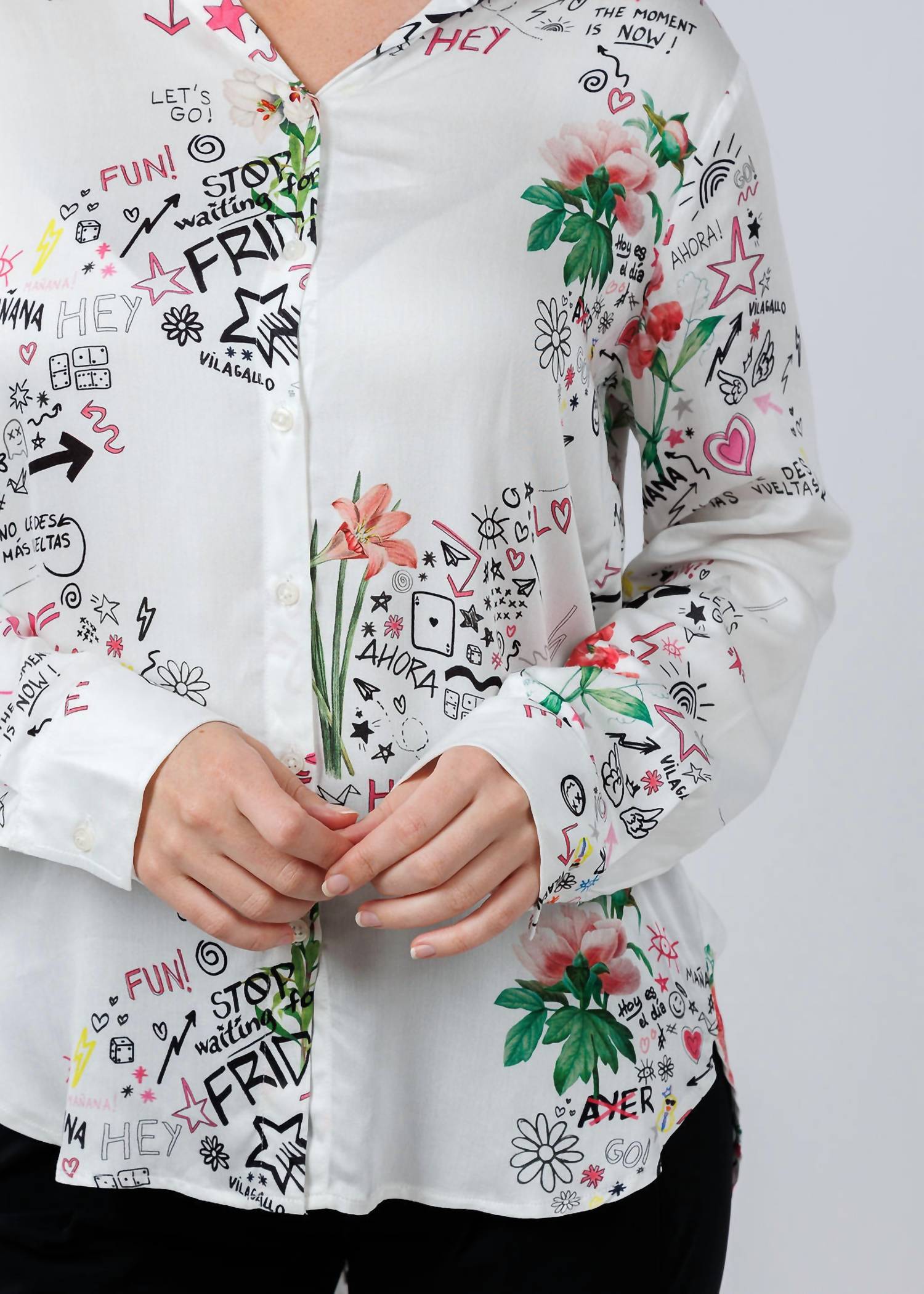 A timeless blouse that will never go out of style. Unveil your bold style with the Vilagallo Gaby Graffiti Print Blouse, an eye-catching statement piece in FLORES/MULTI. This blouse features long sleeves and a high-low hem for added flair. Made from 100% viscose, it showcases a unique graffiti-inspired print with subtle floral touches. Designed with a shirt collar and a convenient button front closure, this relaxed fit top is perfect for adding a splash of streetwear trend to your wardrobe.