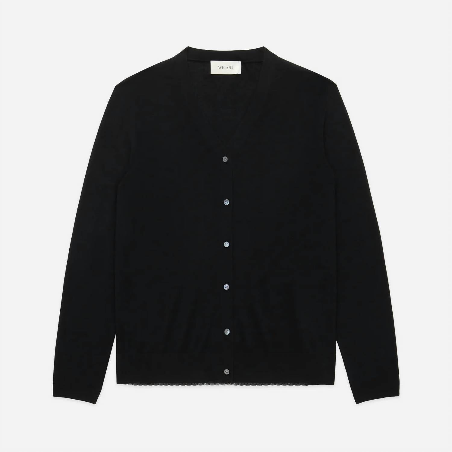 Throw this adorable cardigan over any cami or tank top. Discover the Daisy Long Sleeve Cardigan by WE-AR4, an elegant blend of style and sustainability in black. This cardigan is crafted from upcycled merino wool and a cupro blend, featuring a unique lace back hem detail for a romantic touch. It boasts a classic v-neck and button closure, designed as a versatile layering piece perfect for various occasions. Care: Hand wash. With only 59 units produced, it’s a rare find for any wardrobe.