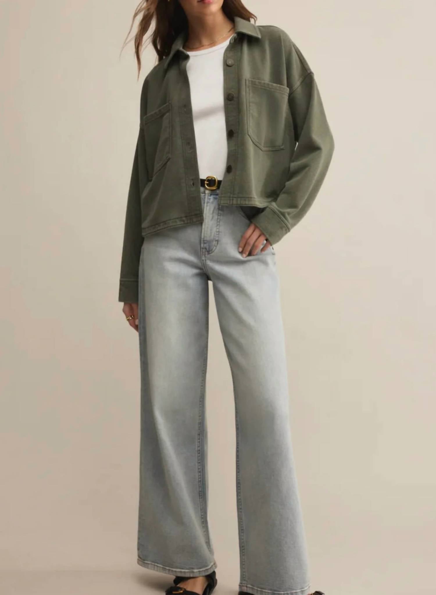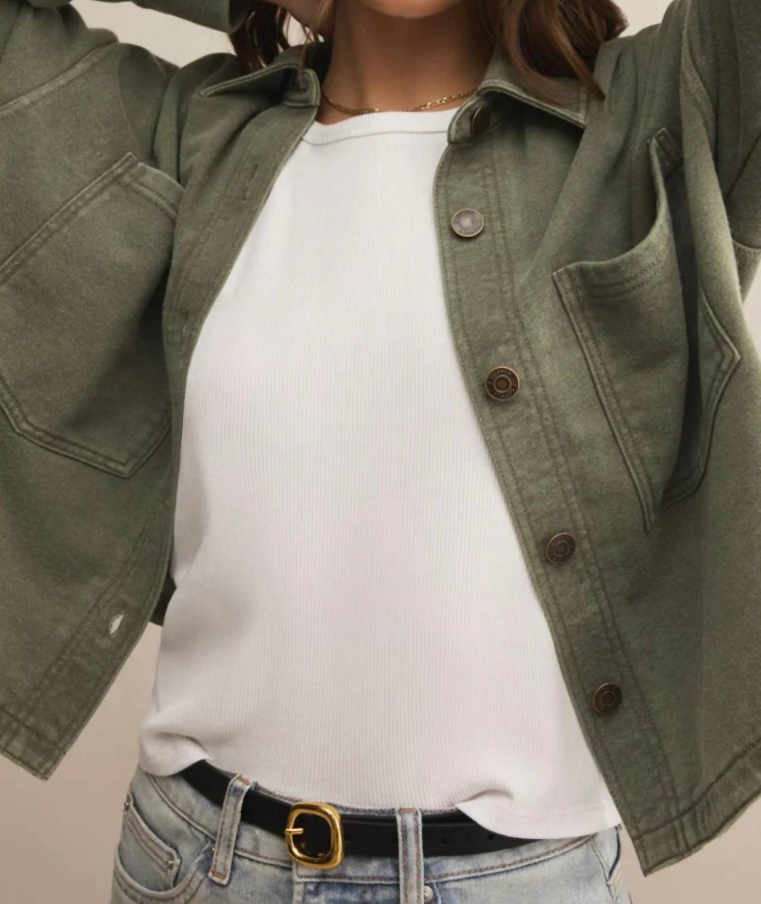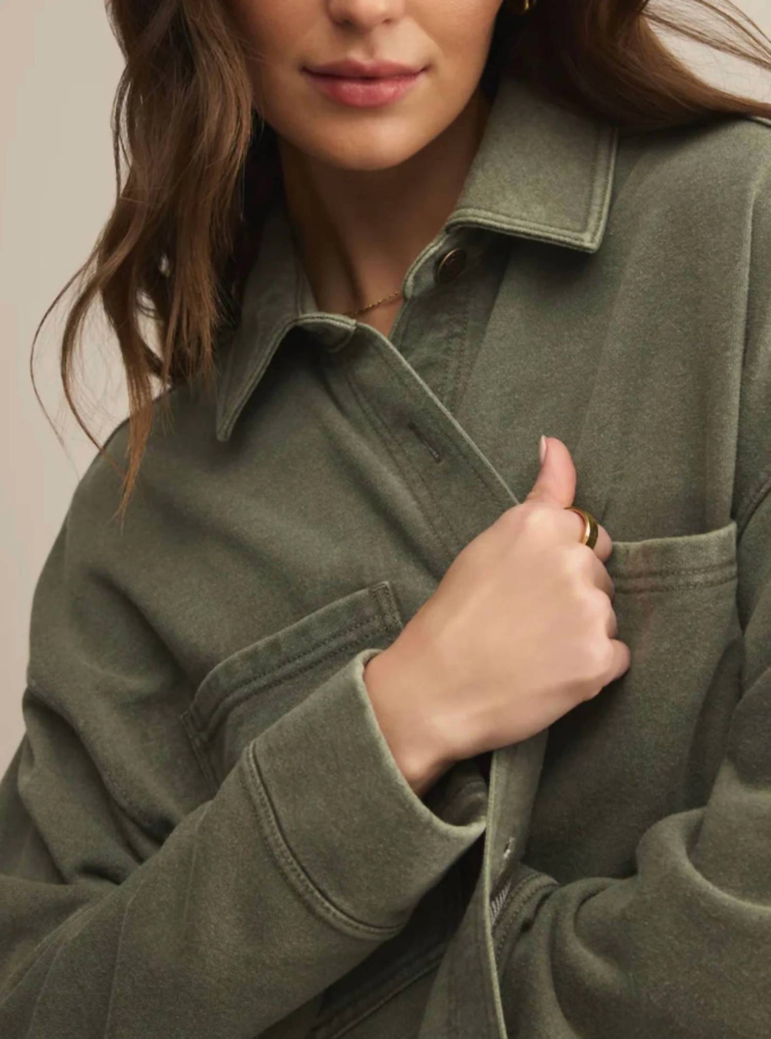 A jacket so versatile you can literally wear it with anything. Embrace comfort and effortless style with the Women's All Day Cropped Knit Jacket by Z Supply in Hunter Green. This jacket boasts long sleeves and is crafted from a knit denim French Terry blend of 85% cotton and 15% polyester, offering a soft, worn-in feel. The cropped length and button front closure effortlessly complement its casual, relaxed fit, featuring a practical patch pocket and a trendy mineral wash. Ideal for spring getaways, this lightweight piece can be easily maintained with a machine wash in cold water and hung to dry.
