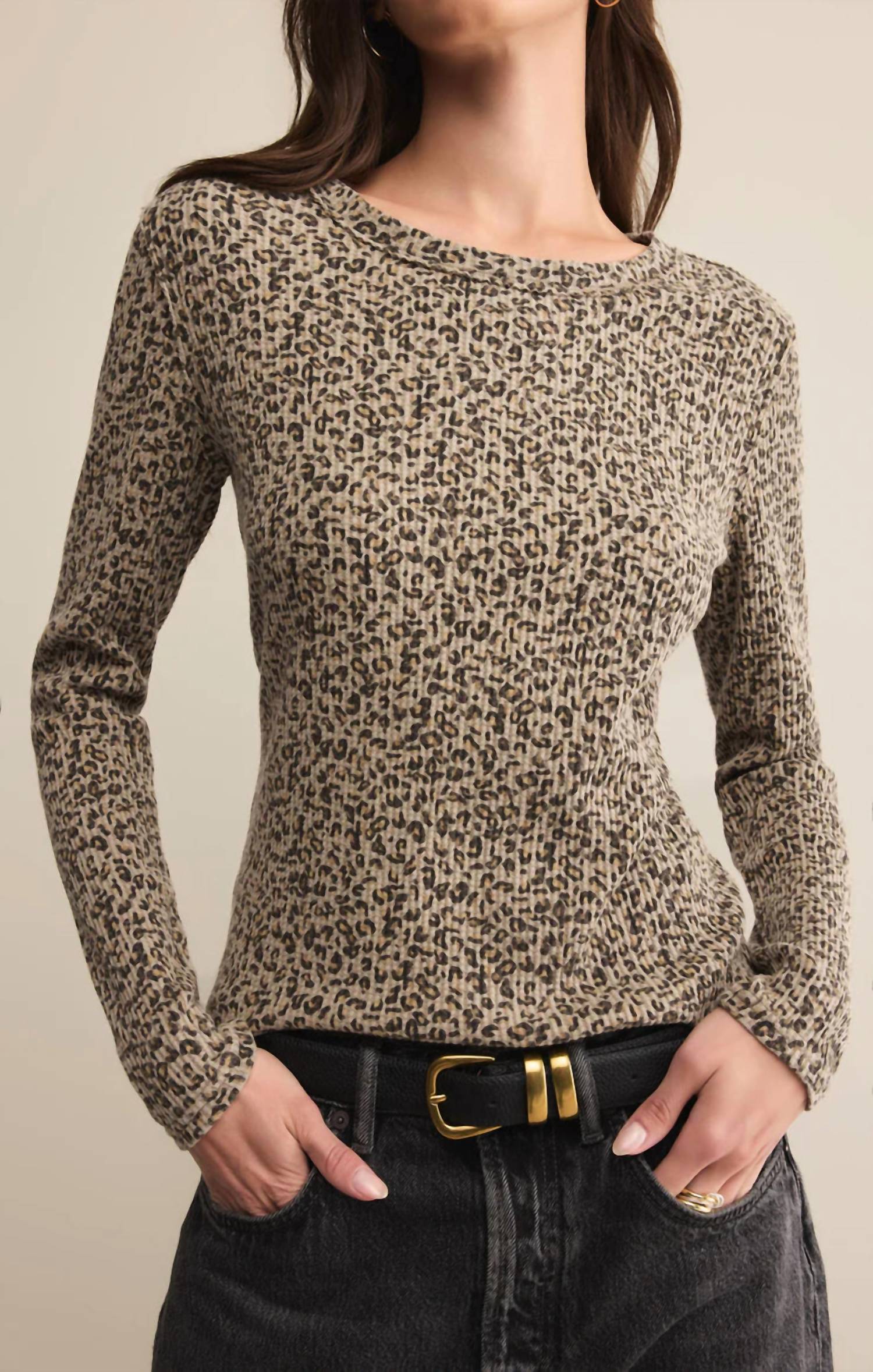 A long sleeve top you can wear with denim, skirts, well... just about anything! Introducing the Women's Arlet Animal Mini Thermal Top by Z Supply, a chic and comfortable addition to your wardrobe. This long sleeve, fitted top is crafted from a waffle thermal blend of 60% cotton and 40% polyester, featuring a unique mini leopard print and raw edges. Designed with a mineral wash for a relaxed yet polished look, it offers a pull-on closure and a classic crewneck. Care is a breeze: simply machine wash on a cold, gentle cycle and hang to dry.