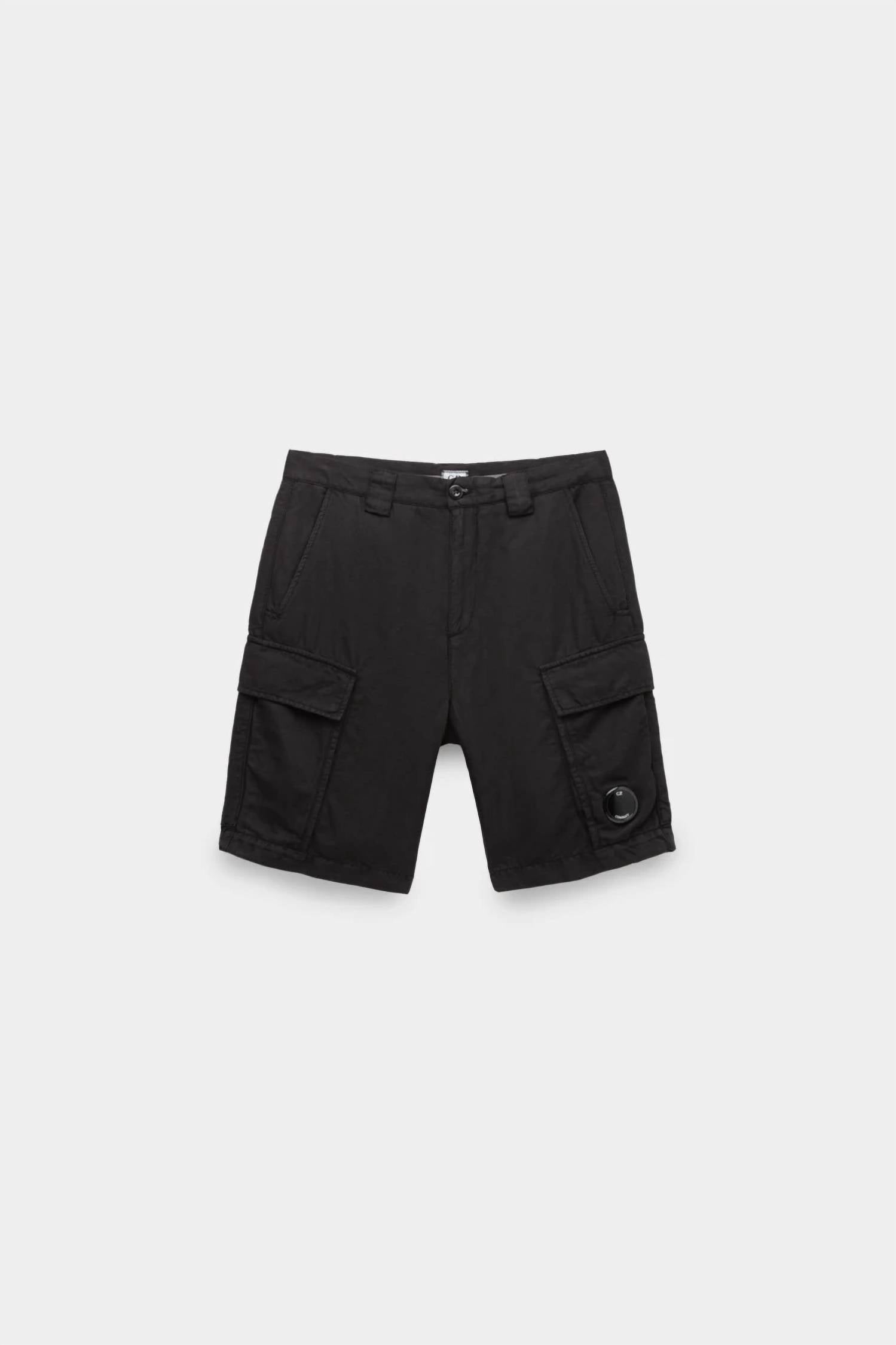 Introducing the Bermuda Cargo Shorts by C.P. Company, a staple for any minimalist wardrobe. Crafted in Tunisia, these shorts feature a robust cotton-linen blend, offering a classic fit with a straight silhouette enhanced by garment dye technology. Equipped with belt loops, zip closure, and a plethora of pockets—including two side, back, and two patch pockets—they provide convenient storage without compromising style. Perfect for a spring outing or a Thanksgiving celebration, these black cargo shorts are modeled in size 48 on a 186 cm model, ensuring a sophisticated yet functional look.
