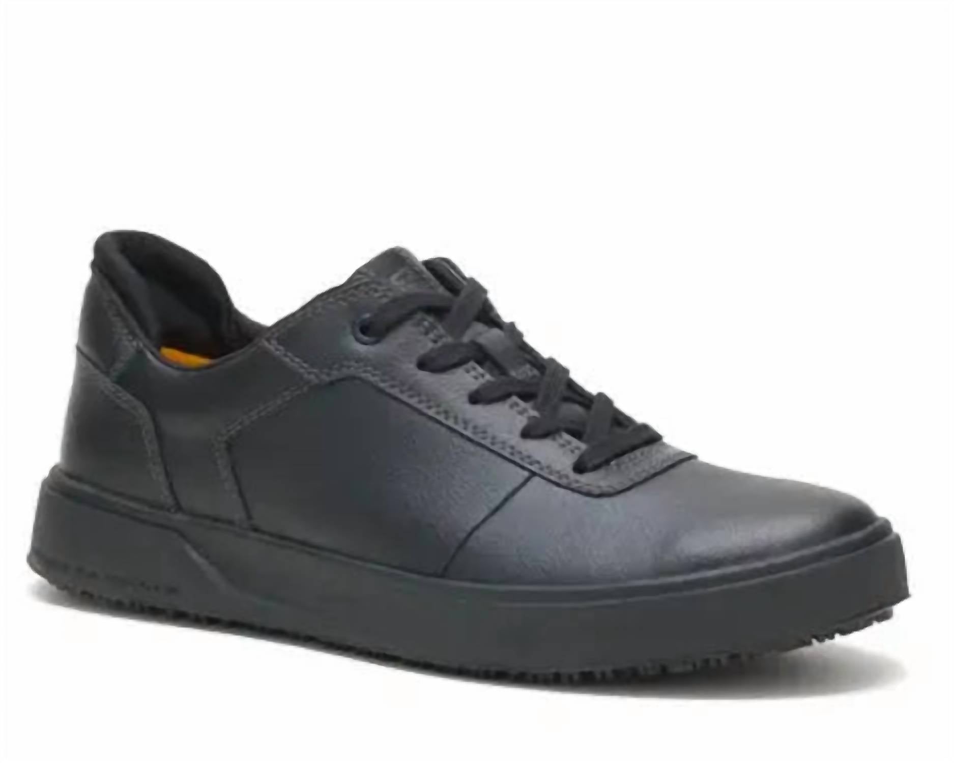 Introducing the CAT PRORUSH SR+ Soft Toe Work Shoes by Caterpillar, designed for ultimate comfort and slip resistance, perfect for men on the go. These black lace-up sneakers feature a medium shoe width and a round toe shape, providing a secure and flexible fit. Crafted for the demands of workwear, these shoes include SR+ rubber outsoles for excellent traction and an EVA midsole to minimize fatigue during long hours on your feet. Suitable for indoor or service roles, they're the ideal choice for spring, offering both style and functionality.