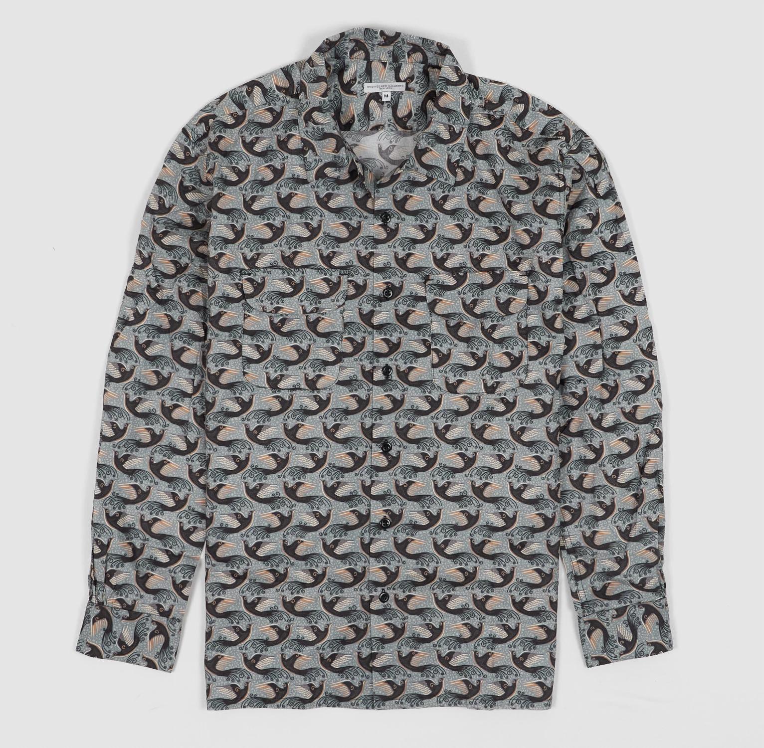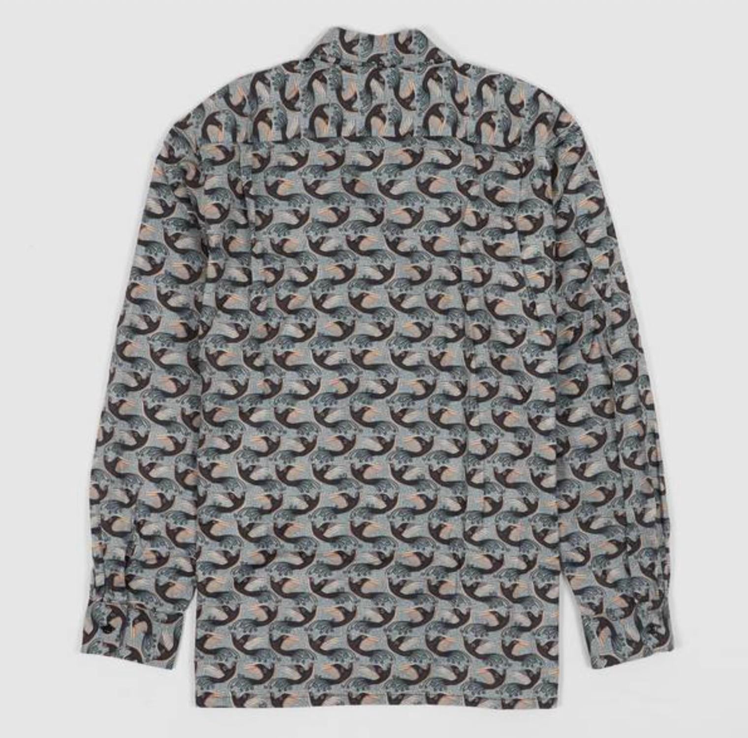 Crafted from 100% cotton, this oversized shirt brings a blend of casual ease and classic American style. It features an open collar, dual chest flap pockets, and a distinctive bird motif print. The wide body width and square-cut silhouette create a relaxed yet refined look, making it a versatile piece for elevating everyday outfits.