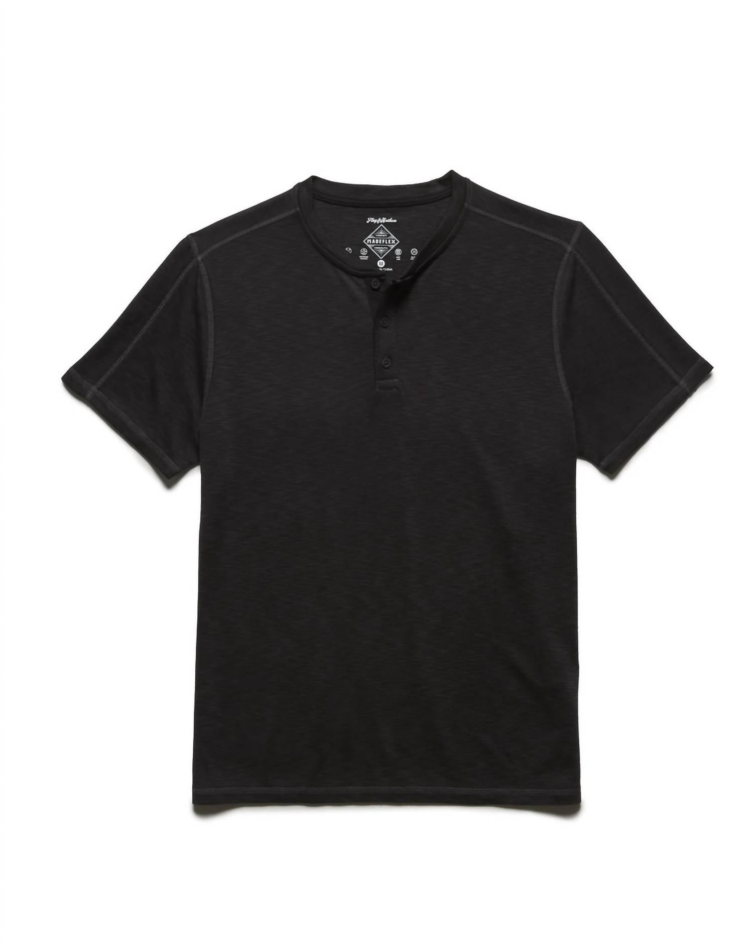 The Madeflex Momentum Slub Performance Henley Tee by Flags & Anthem in black is a perfect match for an active lifestyle with its short sleeves and classic henley styling. Crafted from 70% Modal and 30% Poly, this solid crewneck tee measures 28.5 inches in length from the highest point of the shoulder. It's designed in a tailored athletic fit, featuring MadeFlex Performance Technologies for built-in stretch, moisture-wicking, and all-day comfort. The tee is easy to care for with machine wash instructions and is made abroad.