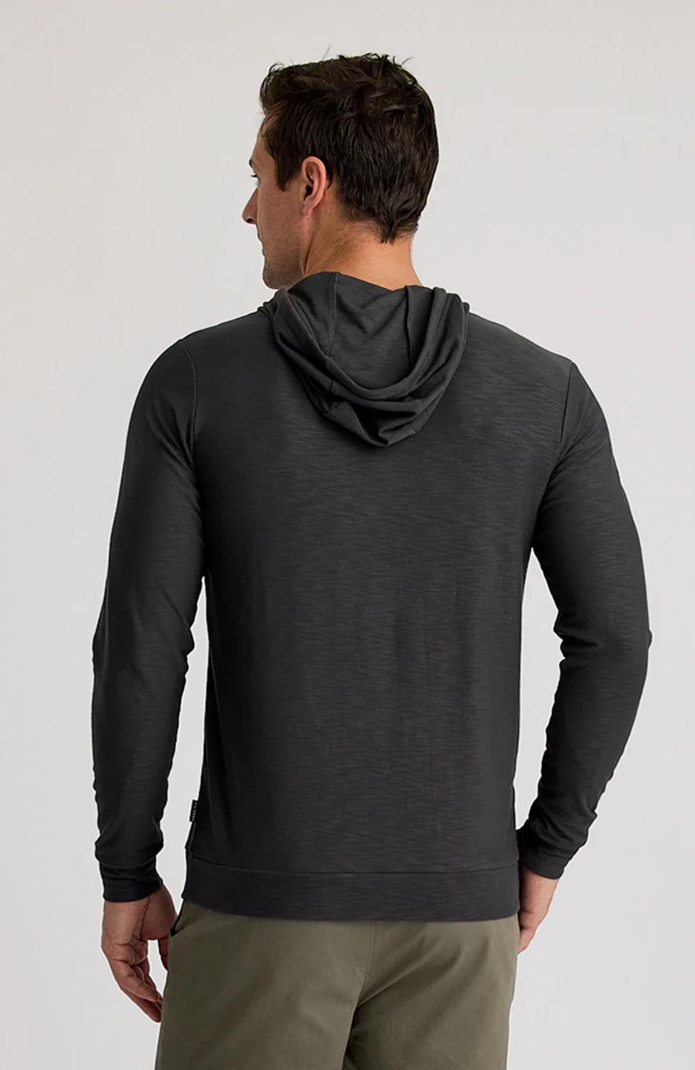 Stay stylish and protected with the Free Fly Men's Bamboo Slub Hoodie II in Black Sand, perfect for travel. This solid long sleeve hoodie boasts a relaxed hood with drawstrings, offering enhanced sun protection. Composed of a 67% Viscose from Bamboo, 29% Polyester, and 4% Spandex blend, it features reinforced cuffs and hem for outstanding shape retention. With a pull-on closure and anti-odor properties, this hoodie ensures all-day freshness. Care instructions include hand washing and laying flat to dry.