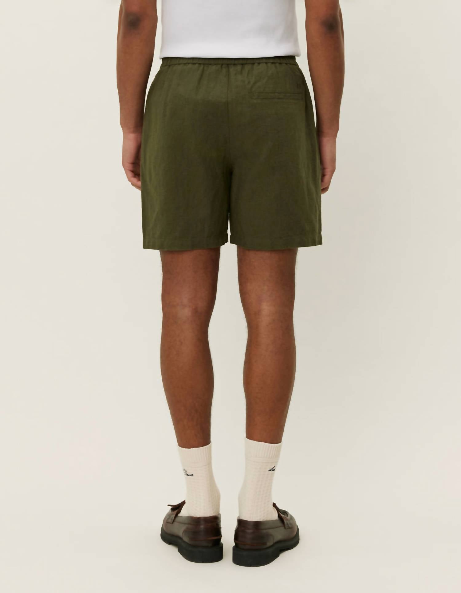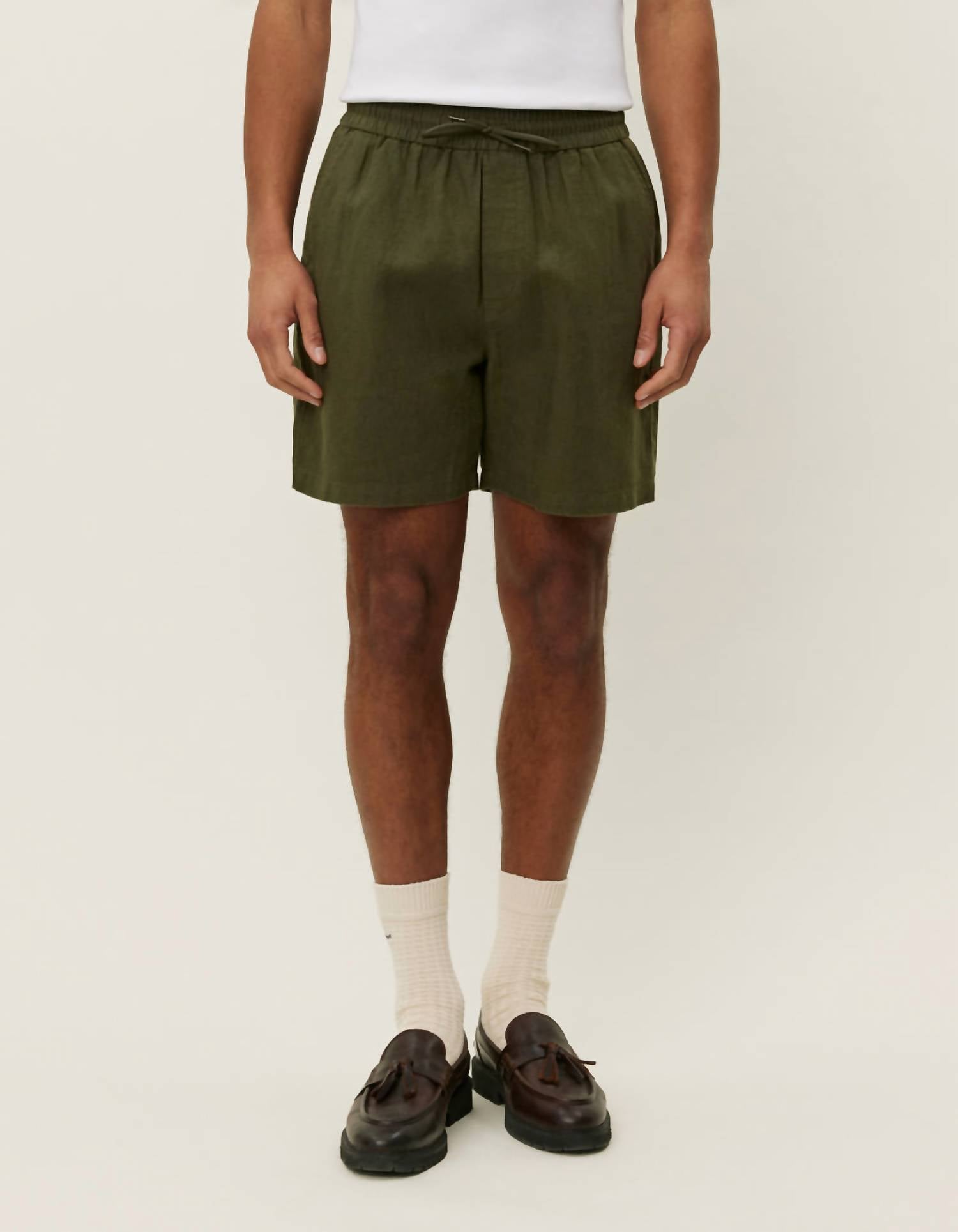 Elevate your summer wardrobe with the Otto Linen Shorts by Les Deux, crafted in a stylish Olive Night hue. These men's shorts feature a comfortable stretch drawstring waist for an adjustable fit and come equipped with side and back welt pockets for added functionality. Composition: 75% Linen, 25% Cotton, ensuring a light and breathable experience ideal for travel and warm days. Closure: Tie closure. Perfect for minimalist fashion enthusiasts, these shorts blend casual style with practical design.