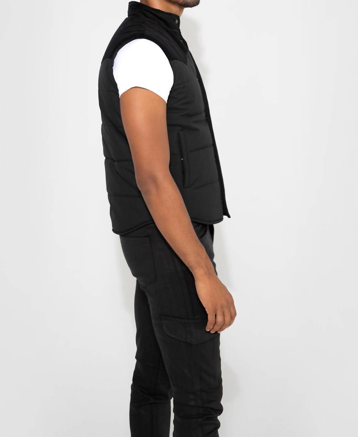 Introducing the Wayne Needle Cord Vest by Monfrere, a sleek option in Noir perfect for refined, clean layering. This sleeveless vest features a standout needle cord shoulder yoke and a stand collar, while snap buttons keep the front orderly. Crafted from a comfortable cotton blend composed of 98% cotton and 2% spandex, it pairs effortlessly over tees and knits. Care instructions: machine wash followed by line drying.