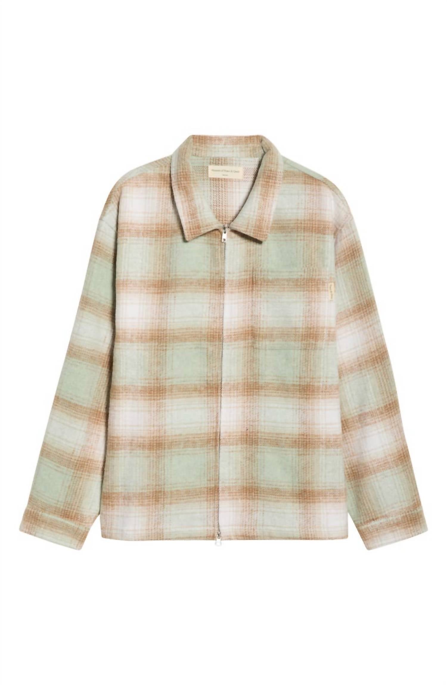 Introducing the Wordmark Plaid Zip Shirt Jacket by Museum of Peace & Quiet, a staple for any fall wardrobe. This men's jacket in green features long sleeves and a spread collar, perfect for a back-to-school 90s fashion vibe. Made from 100% cotton, it offers a comfortable fit with a practical front zip closure and convenient pockets. Its plaided design is imported and is easy to care for with machine wash and tumble dry instructions.