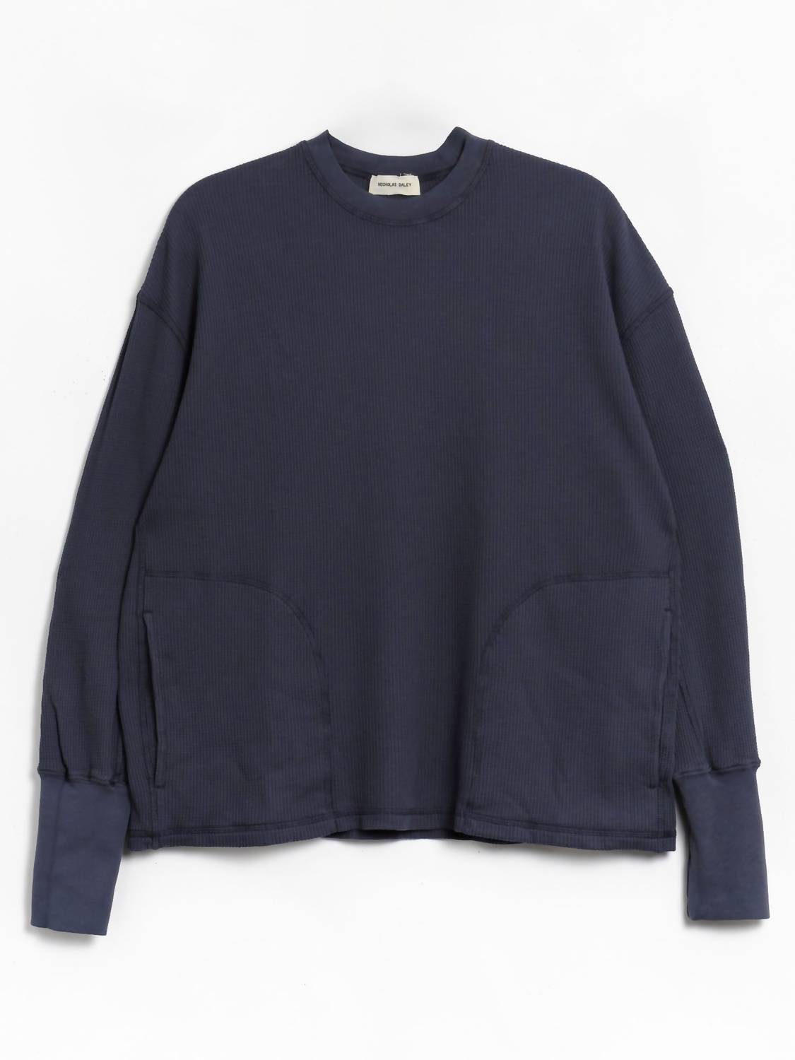 This waffle-knit crewneck is crafted in Portugal from 100% mid-weight cotton, featuring paneled detailing along the body for added texture. Elevated sleeve cuffs and front inseam pockets enhance both style and functionality. The ribbed trims are made from 95% cotton and 5% elastane, providing stretch and a comfortable fit.