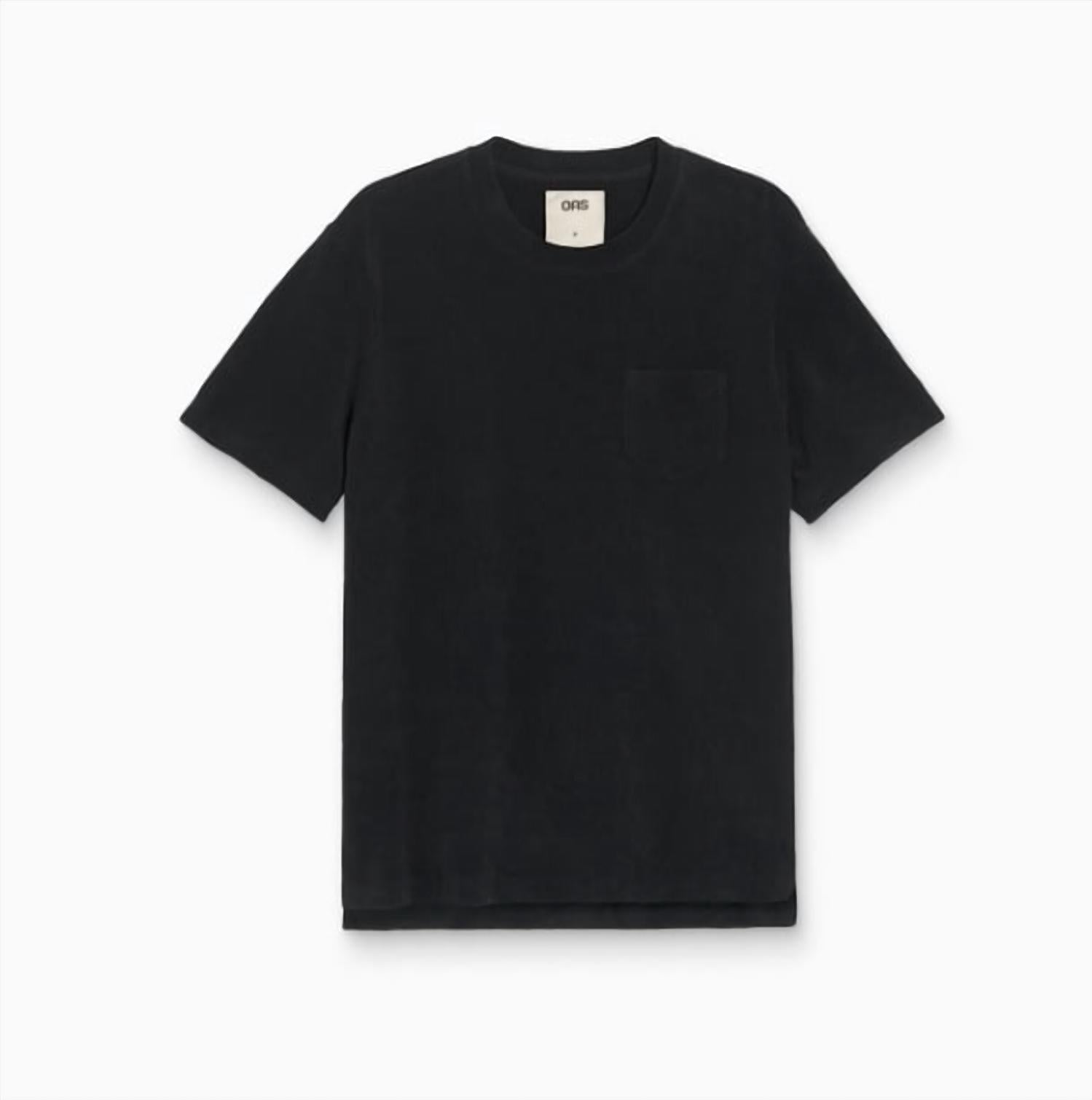 Presenting the Men's Terry Tee by OAS, a perfect blend of comfort and style for your vacation wardrobe in timeless Faded Black. This short sleeve tee is crafted from 100% knitted terry cotton, featuring a crewneck and a relaxed fit with a chest pocket for added practicality. Designed in Stockholm and made in Portugal, this tee is pull-on for easy wear. Embrace seasonal streetwear trends with this breathable, solid pattern essential ideal for spring escapades.