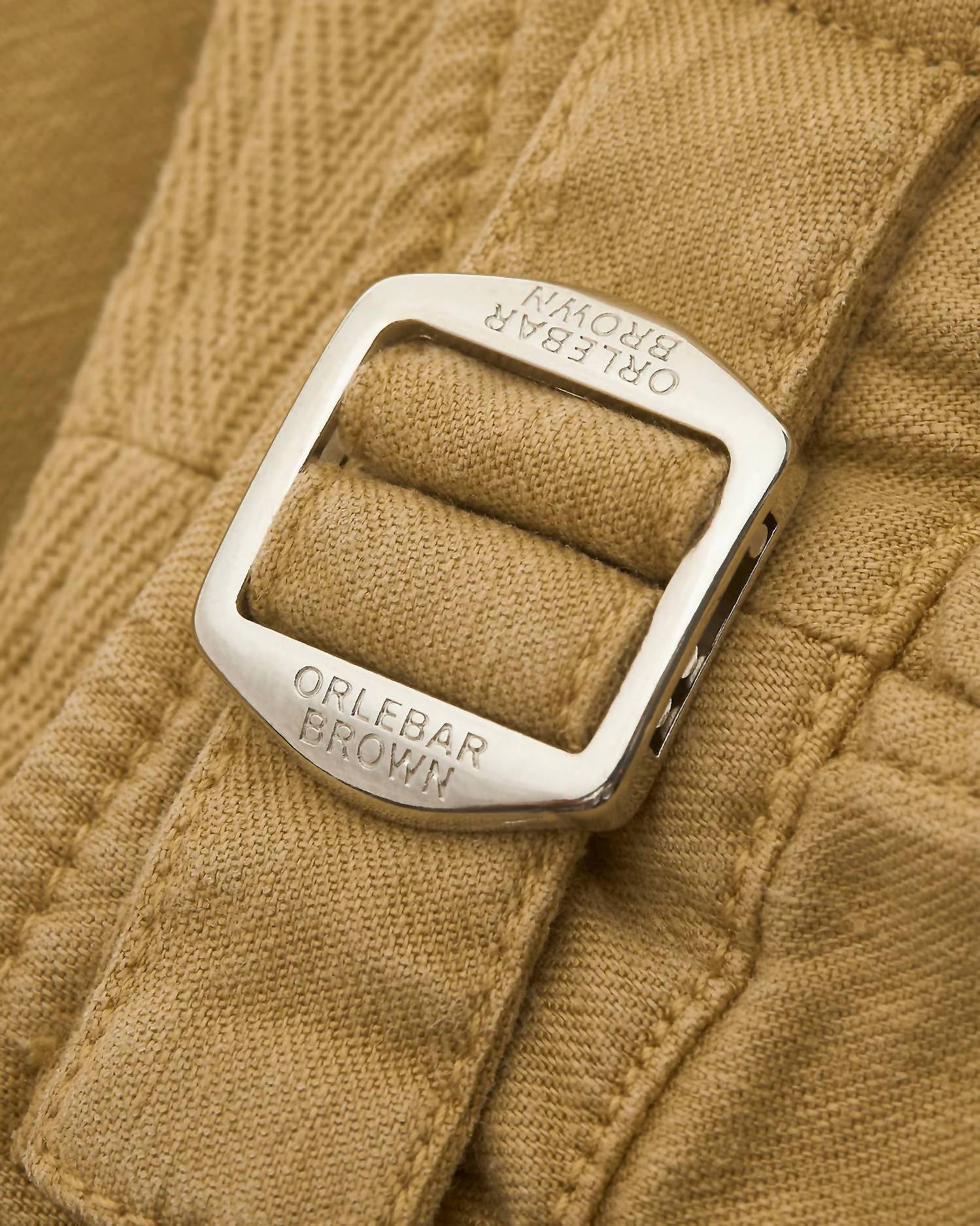 Introducing the Orlebar Brown Bulldog Linen Blend Shorts in an earthy Agave Green, perfect for vacation wear. These men's shorts are crafted with a stretch-linen blend (54% linen, 43% lyocell, 3% elastane) woven in Italy, ensuring both breathability and comfort. Designed with a longer length and signature adjustable side fasteners, they feature a shiny nickel-effect hook & bar closure, a zip fly, and branded puller. Made in Portugal, this solid pattern piece is your go-to for a summer escape.