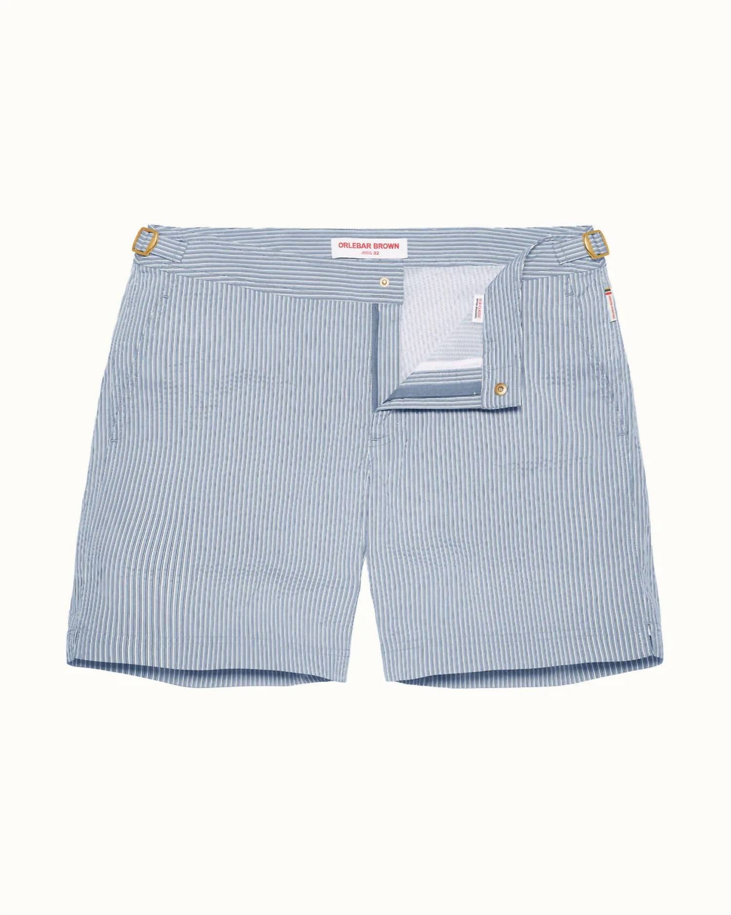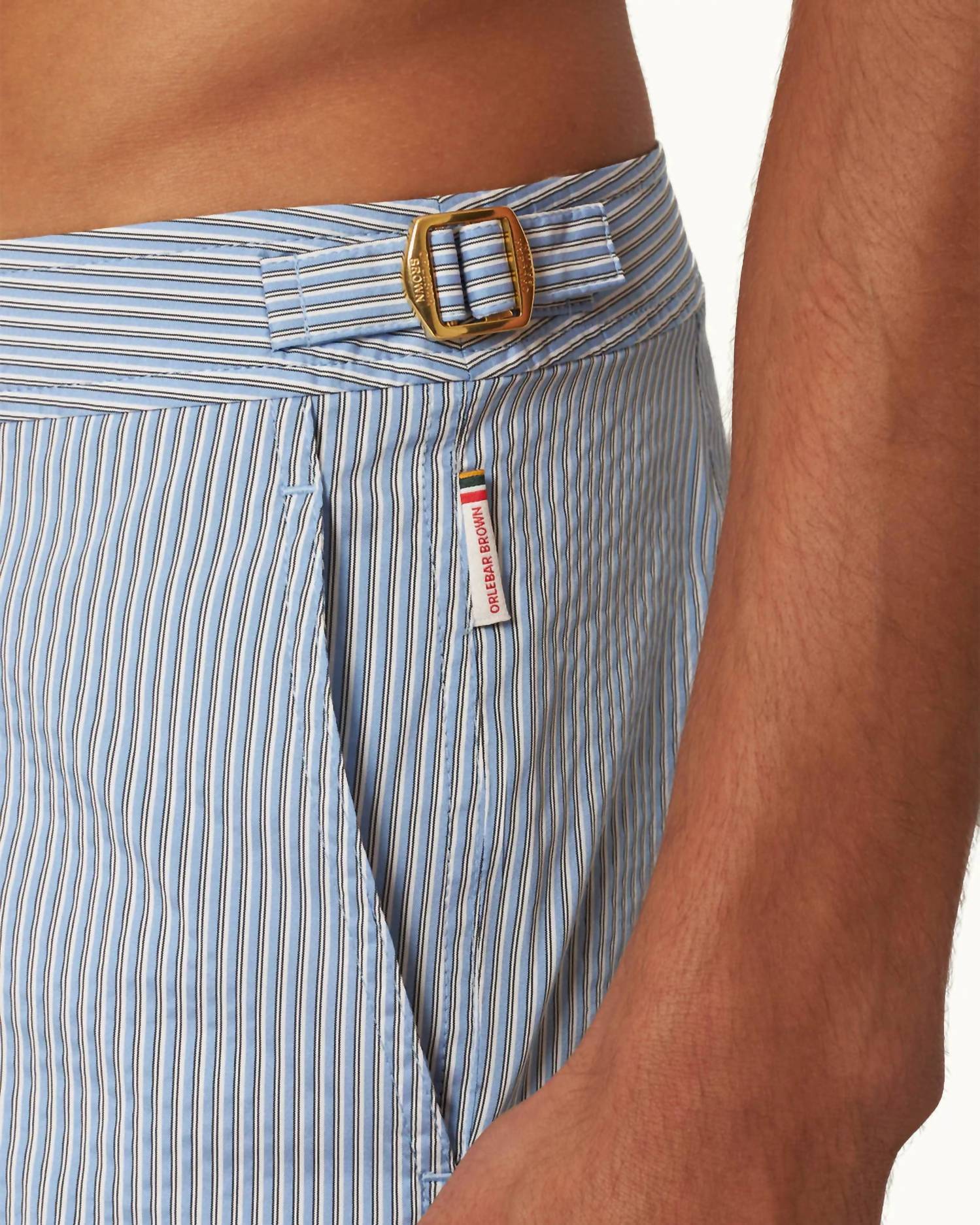 Introducing the Bulldog Classic Stripe Swim Shorts by Orlebar Brown, perfect for your next beach day in wave blue. Featuring a signature Bulldog fit, these shorts are crafted from textured stripe fabric woven in Italy. They offer adjustable branded gold-effect side fasteners and a gold-effect concealed snap closure for a refined look and the best fit. Closure: Zip closure. Ideal for summer, these stylish shorts combine comfort and sophistication effortlessly.