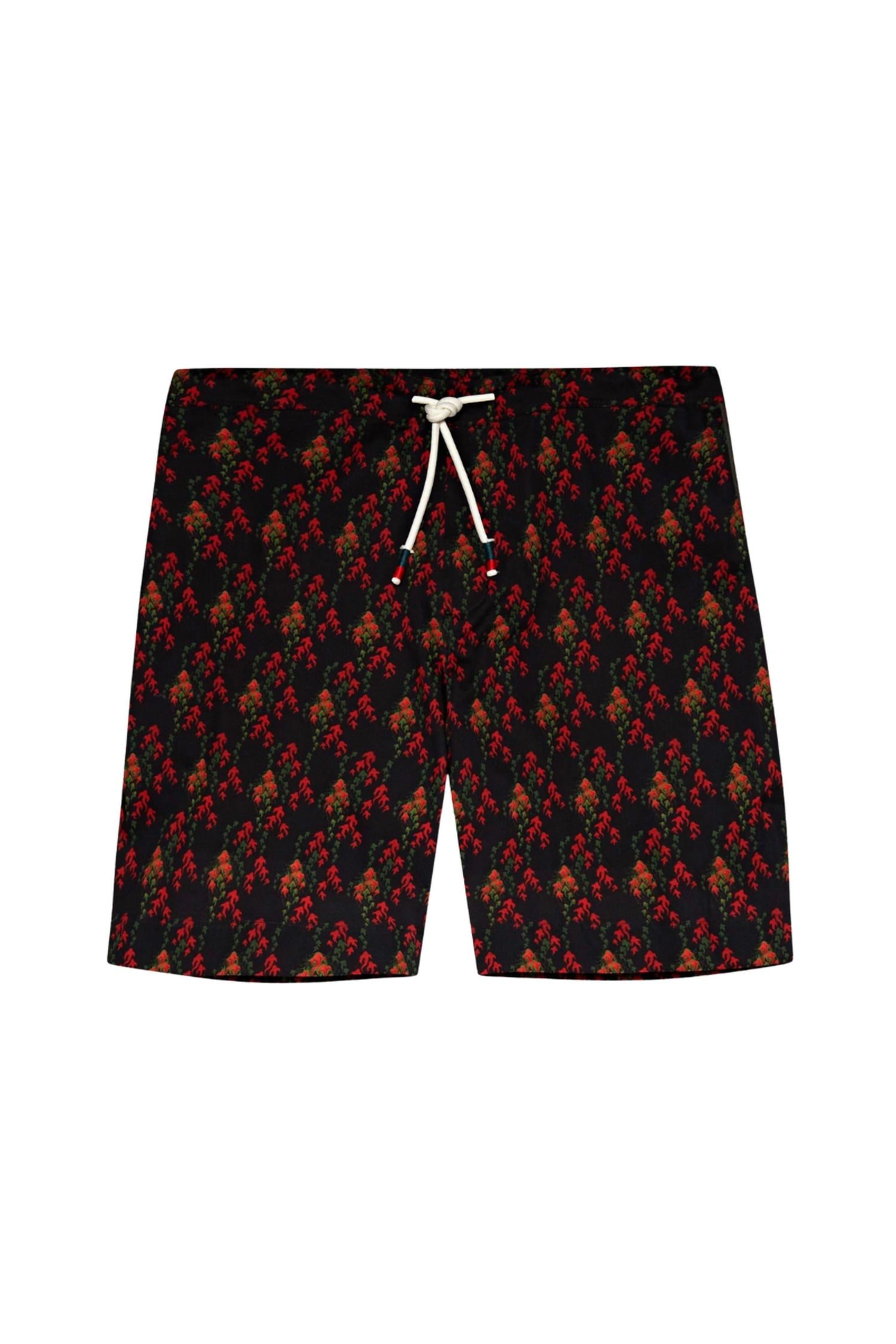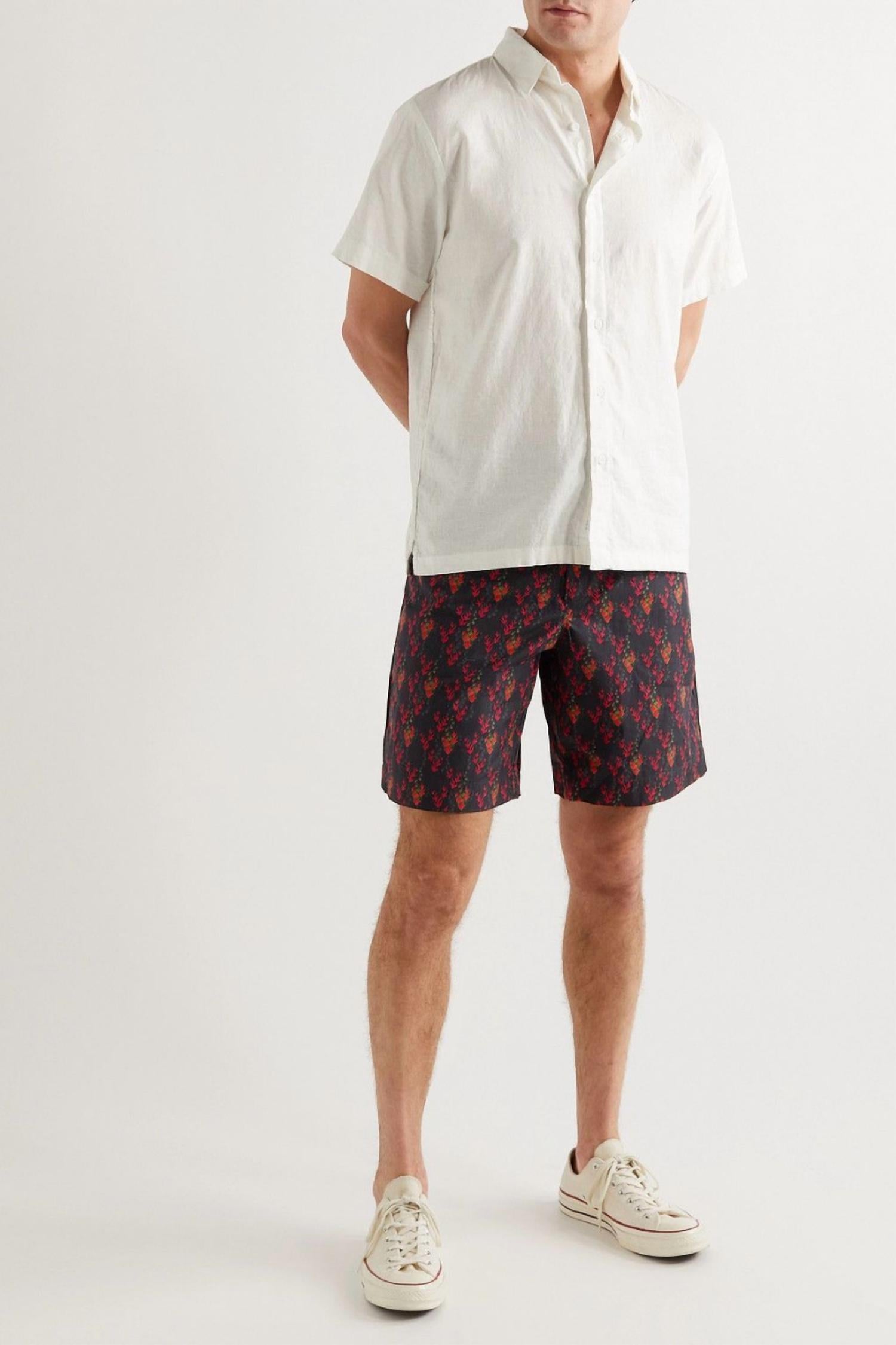 Explore the Devlin Aquila Printed Cotton Drawstring Shorts by Orlebar Brown, a perfect addition to your summer wardrobe in a striking Black Port hue. These men's shorts are crafted from 100% lightweight Italian cotton-poplin, featuring a unique aquila-leaf motif. The shorts include pockets with distinct piping and striped tips on the drawstring, offering both style and functionality. Designed for a pull-on closure, they embody a boho chic trend that suits any holiday party occasion.