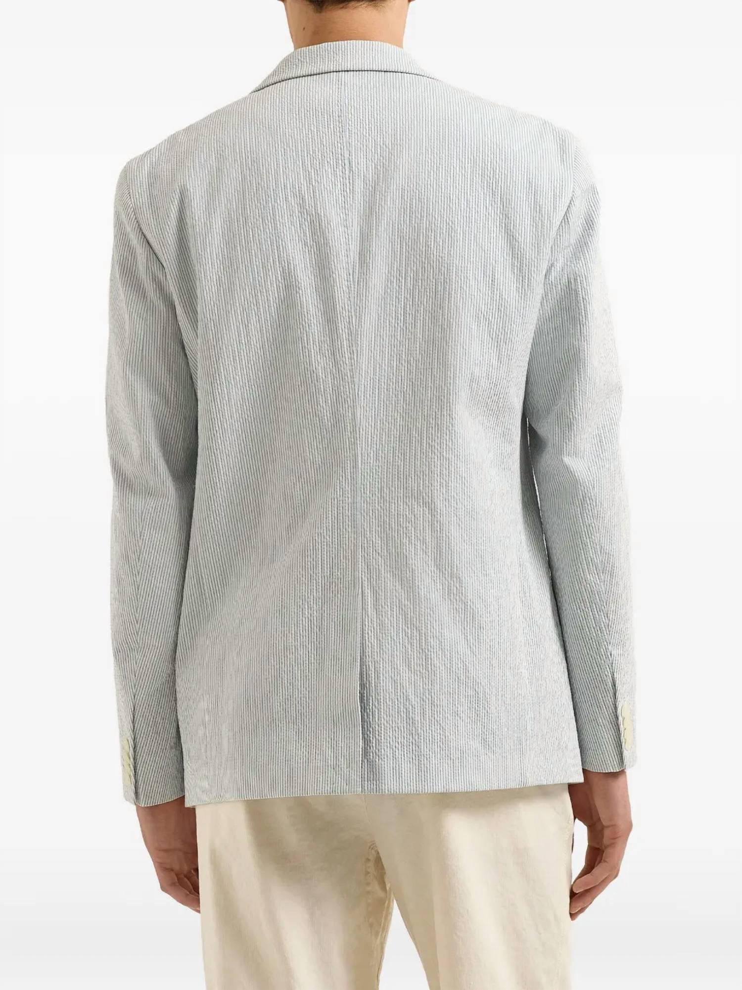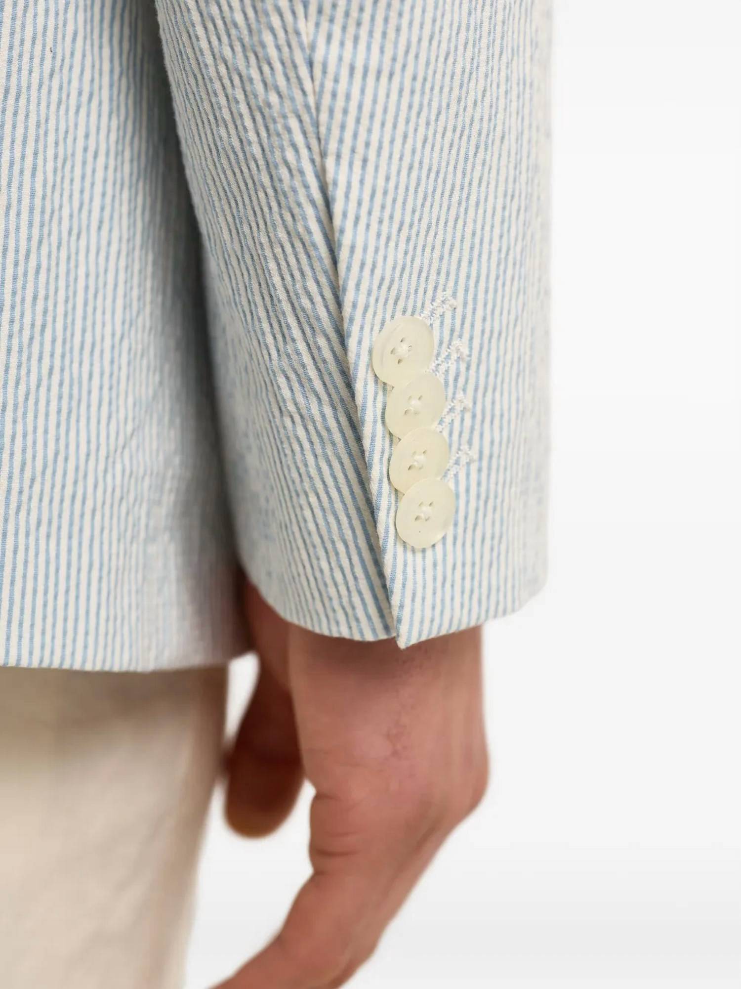 Introducing the Garret Pinstripe Blazer by Orlebar Brown, a sophisticated choice for holiday gatherings, especially Thanksgiving. This long sleeve blazer features a stylish pinstripe pattern in midnight navy white and is made from a cotton blend (97% cotton, 3% elastane) with a lining of 55% cotton and 45% cupro to ensure comfort. Designed with notched lapels, it includes a single-button closure, a chest pocket, and front pockets for seamless utility. For best results, opt for specialist cleaning. Perfect for a vintage-inspired look this fall season.