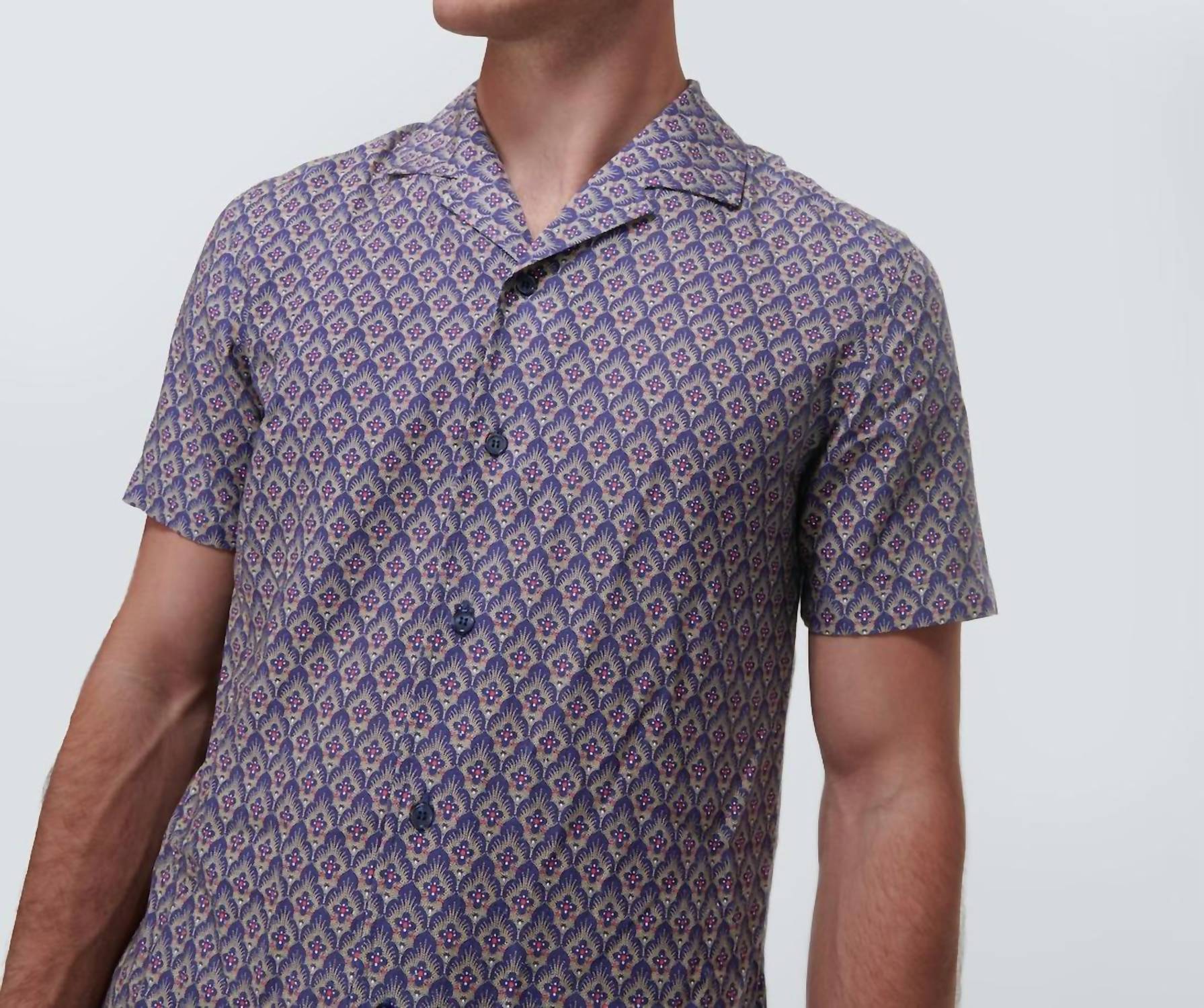 Elevate your spring wardrobe with the Hibbert Sunny Deco Linen Shirt by Orlebar Brown in Midnight Navy. This patterned, short sleeve shirt combines comfort and style with its 20% linen and 80% viscose blend. The classic collar and button closure provide a polished look, perfect for holiday parties and boho-chic occasions. Designed for men, this versatile piece is a must-have for any fashion-forward wardrobe.