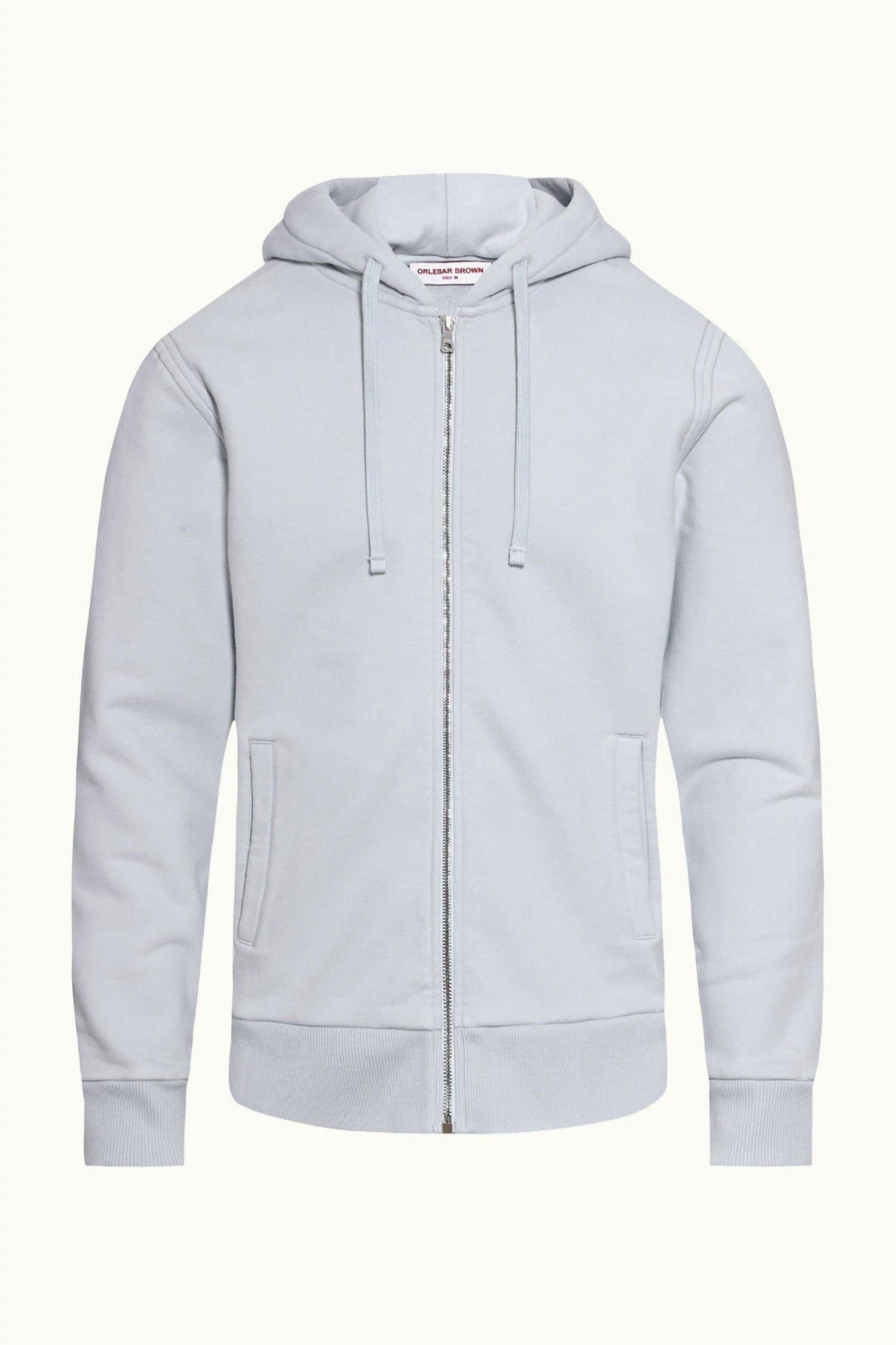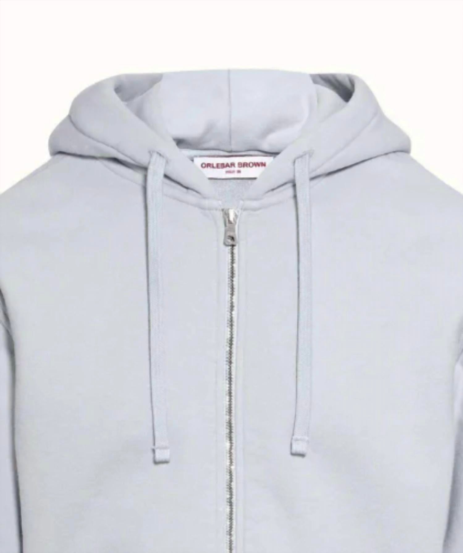 Introducing the Orlebar Brown Men's Mathers Full-zip Hoodie, a staple piece for a minimalist wardrobe scheme, designed in a serene blue hue. This solid pattern hoodie features long sleeves, a classic zip closure, and is crafted from a cotton blend composition of 89% cotton, 8% PA, and 3% EA. Ideal for spring travel and Easter occasions, this hoodie includes practical pockets and a comfortable hooded neckline. For optimal care, this men's activewear piece should be dry cleaned.