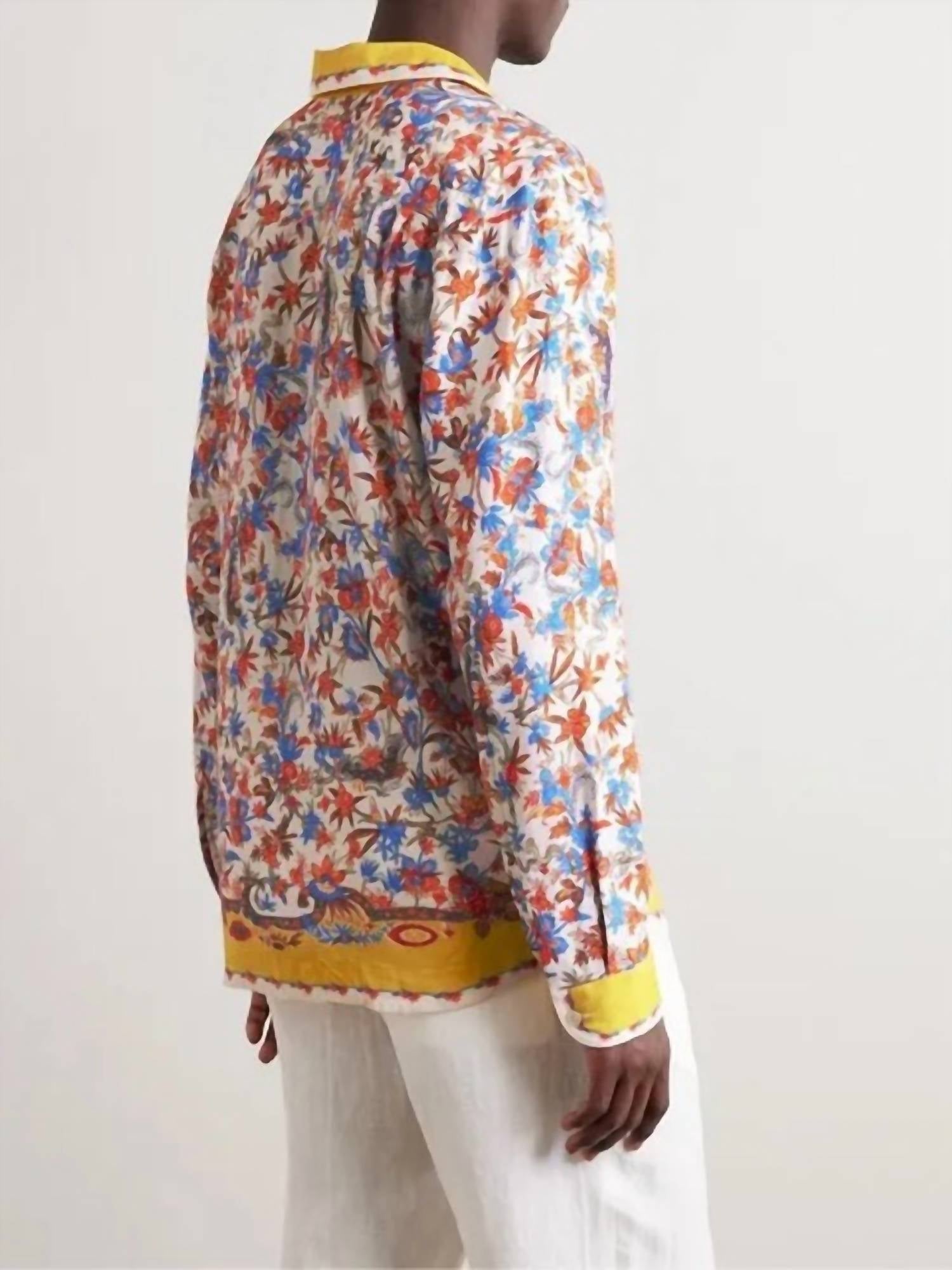 Embrace the Boho Chic trend with the Orlebar Brown Ridley Utopia Linen Shirt, perfect for Spring outings and holiday parties. This men's shirt in a Summer Sunset hue features long sleeves and a collar, offering a sophisticated floral pattern for a touch of elegance. Crafted from a 20% linen and 80% viscose blend, this pull-on shirt ensures comfort and style. Care instructions are not specified.