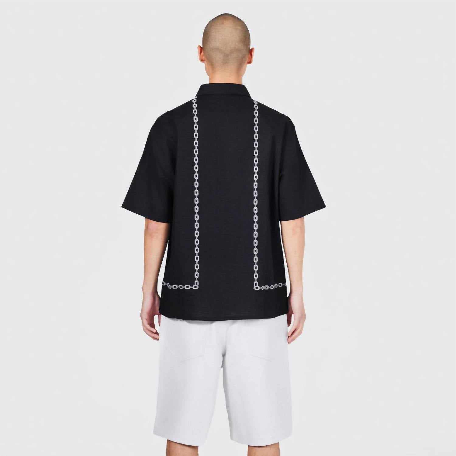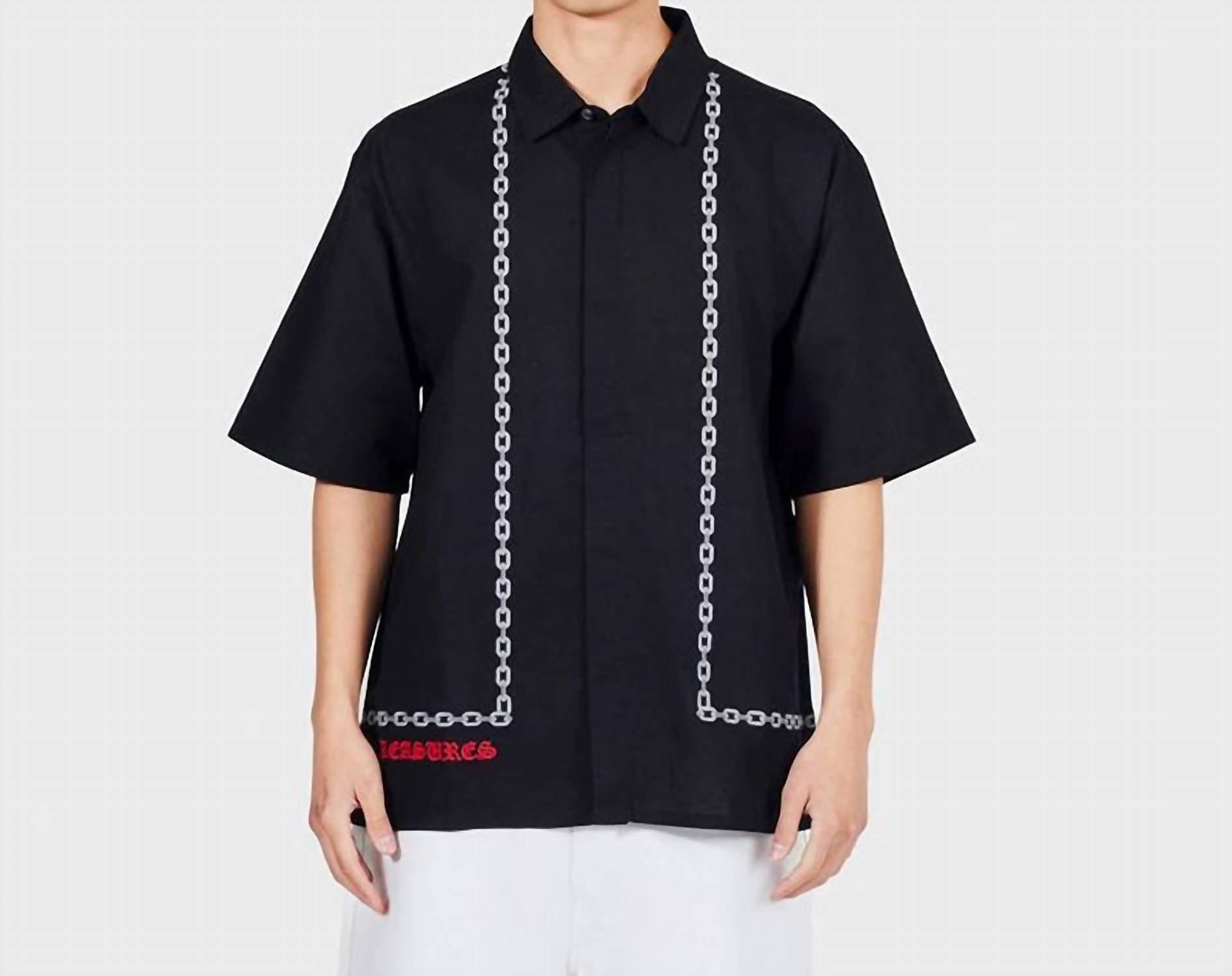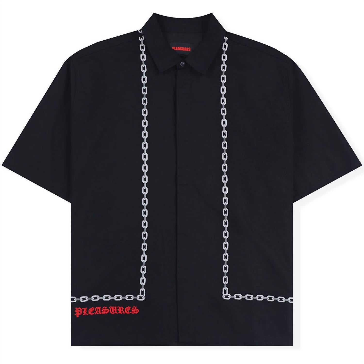 Introducing the Chain Button Up Shirt by PLEASURES, a short sleeve shirt crafted from a lightweight 55% linen and 45% cotton blend. This stylish piece in black features a striking embroidered grey chain pattern on both sides and a red embroidered PLEASURES logo. Designed for a slightly oversized fit, it includes a button closure with a hidden placket for a polished look. Machine wash and tumble dry.