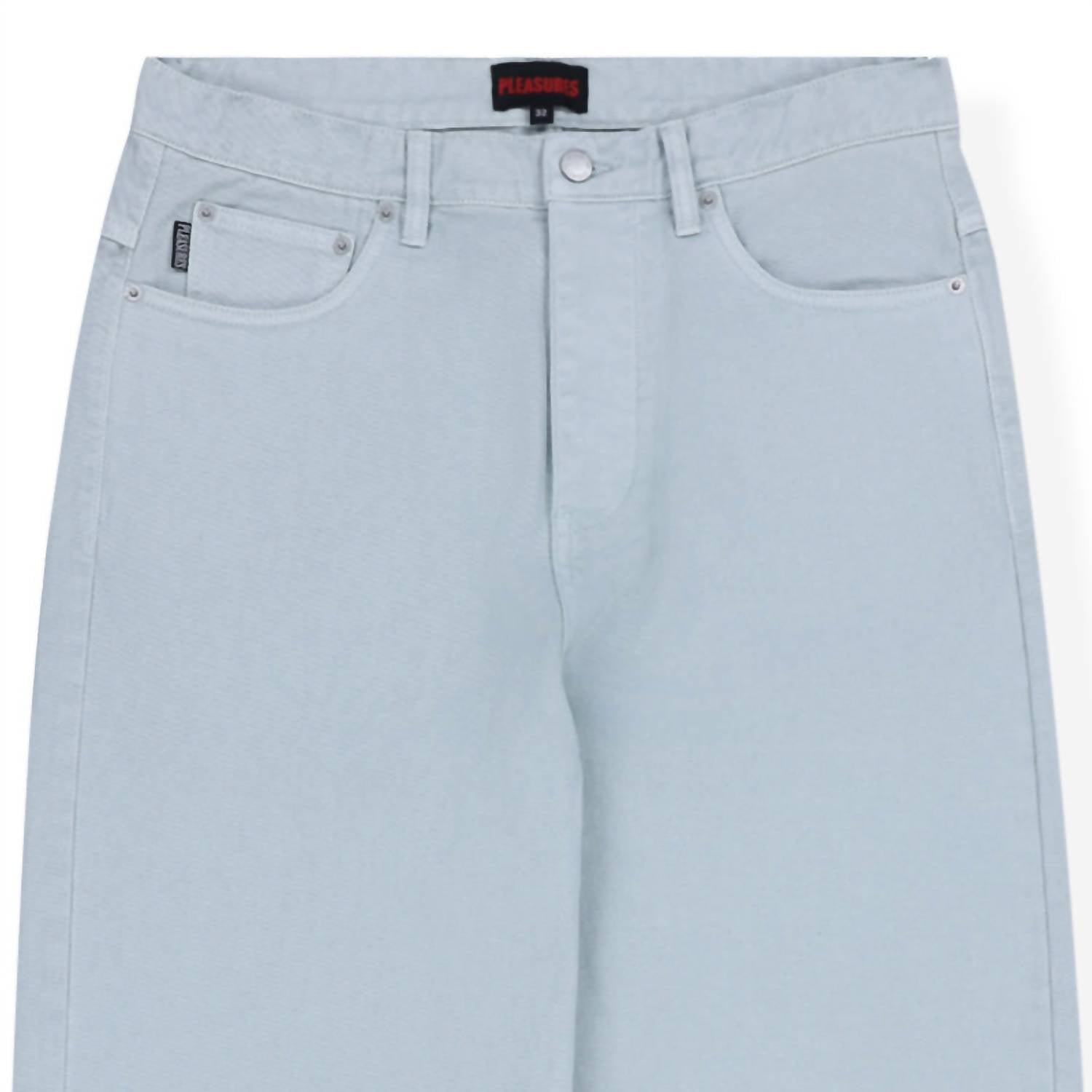Meet the PLEASURES Formula Baggy Pants in a stylish Light Grey, perfect for a relaxed yet trendy look. Crafted from 100% Cotton, these denim pants present a light blueish-grey faded wash with a signature dot logo near the knee and a woven flag tag. Featuring a standard 5-pocket design and a White leather debossed belt patch, these pants come with a zip closure for effortless wear. Care for them easily with machine wash and tumble dry methods.