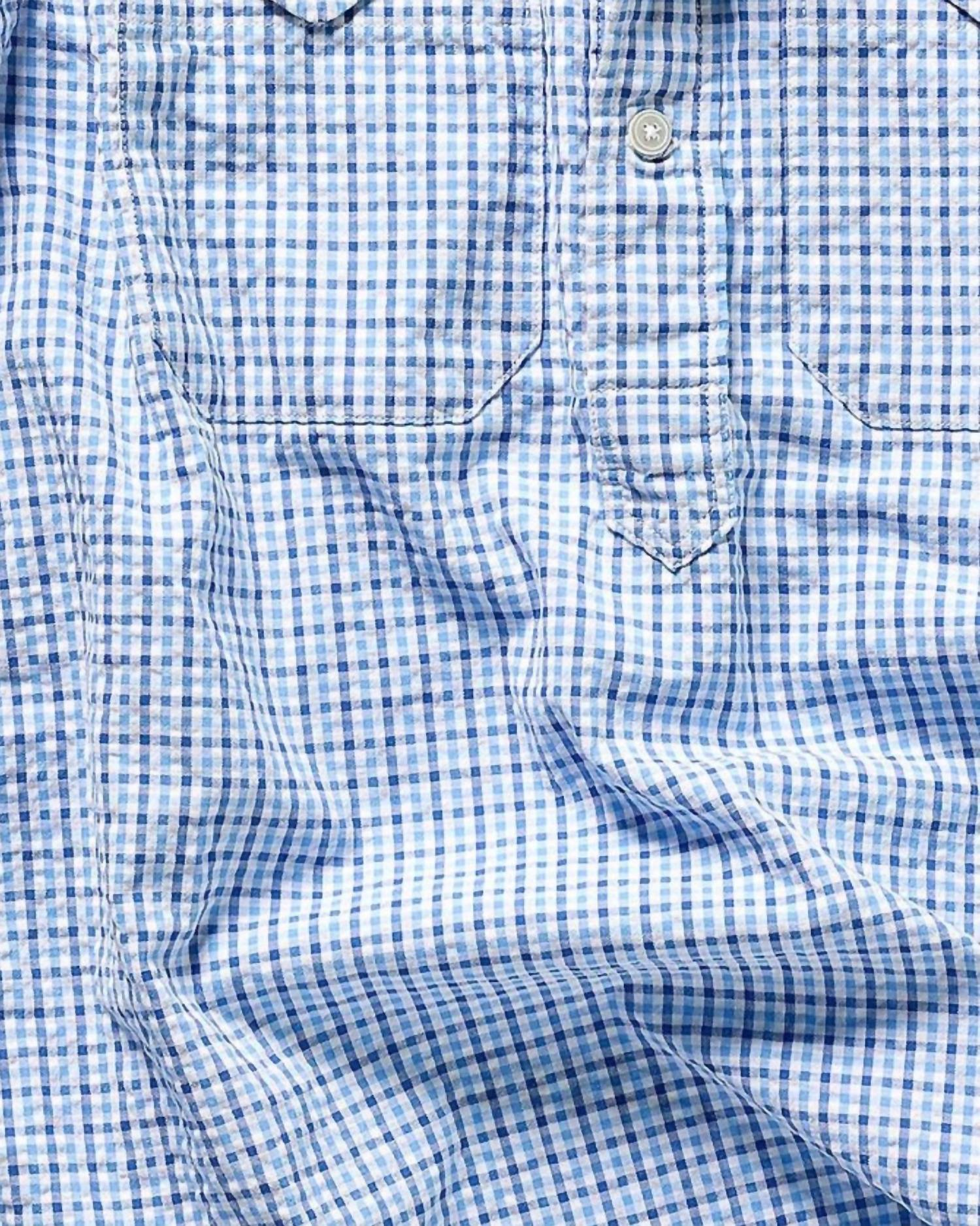 Introducing the Men's Seersucker Popover Polo Shirt by Relwen, a unique addition to elevate your style. Designed with long sleeves, this shirt features a 100% cotton composition, making it perfect for summer occasions. The shirt flaunts a relaxed fit with a white/blue check pattern and a deep 11" button placket, enhanced by split sideseams and double patch flap chest pockets. Crafted in a woven style, it brings together comfortable wearability and a touch of flair. Care instructions include machine washing cold without bleach or softeners and line drying without ironing.
