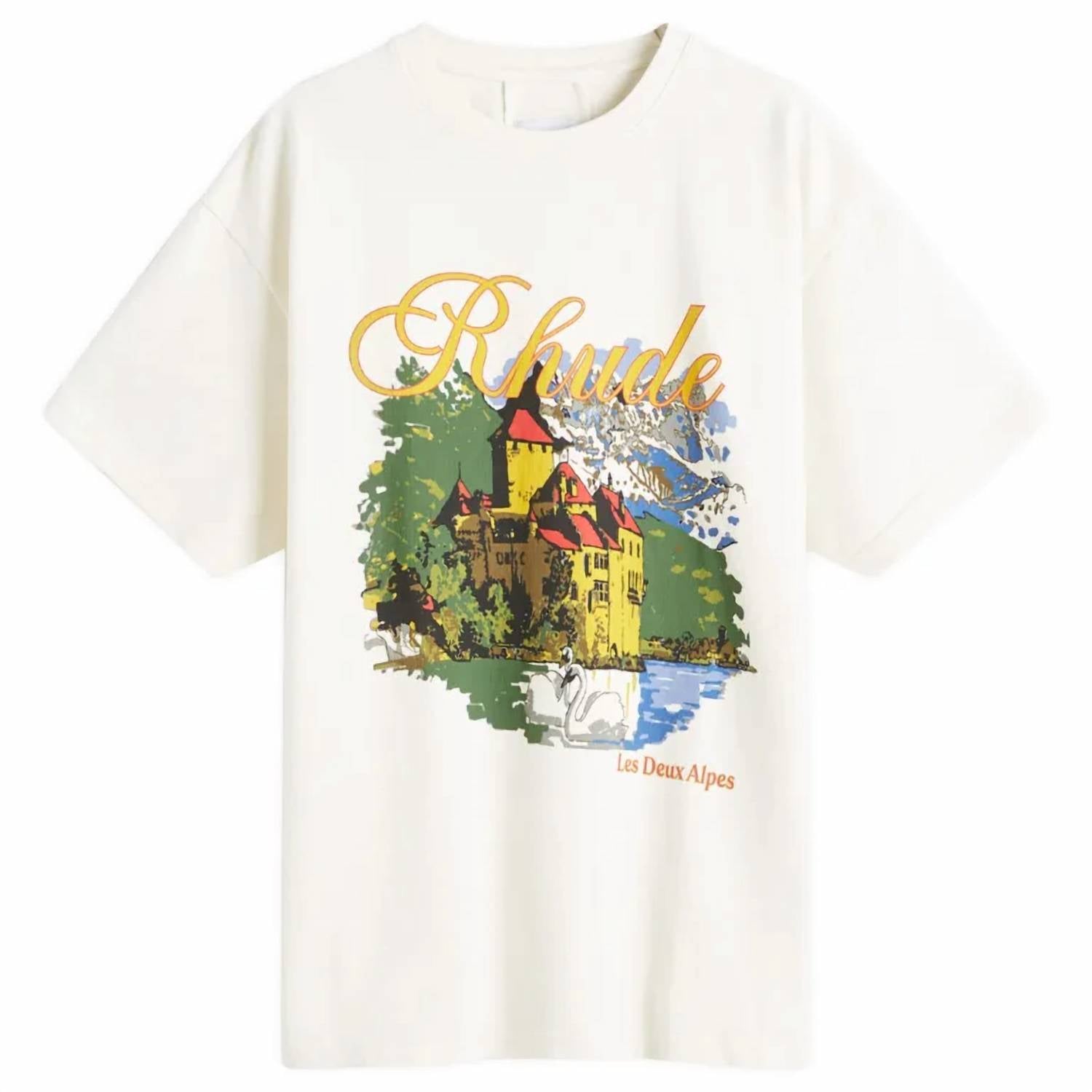 Introducing the Chateaux Alpes T-Shirt by Rhude, a cream-colored piece that blends luxury with streetwear for a standout vacation look. Crafted from 100% cotton, this short sleeve tee features a graphic pattern and a classic crewneck design. Originating from a brand that treasures style and culture, its pull-on closure ensures comfort and ease. Care is simple with machine washable instructions, making it a practical choice for your wardrobe.