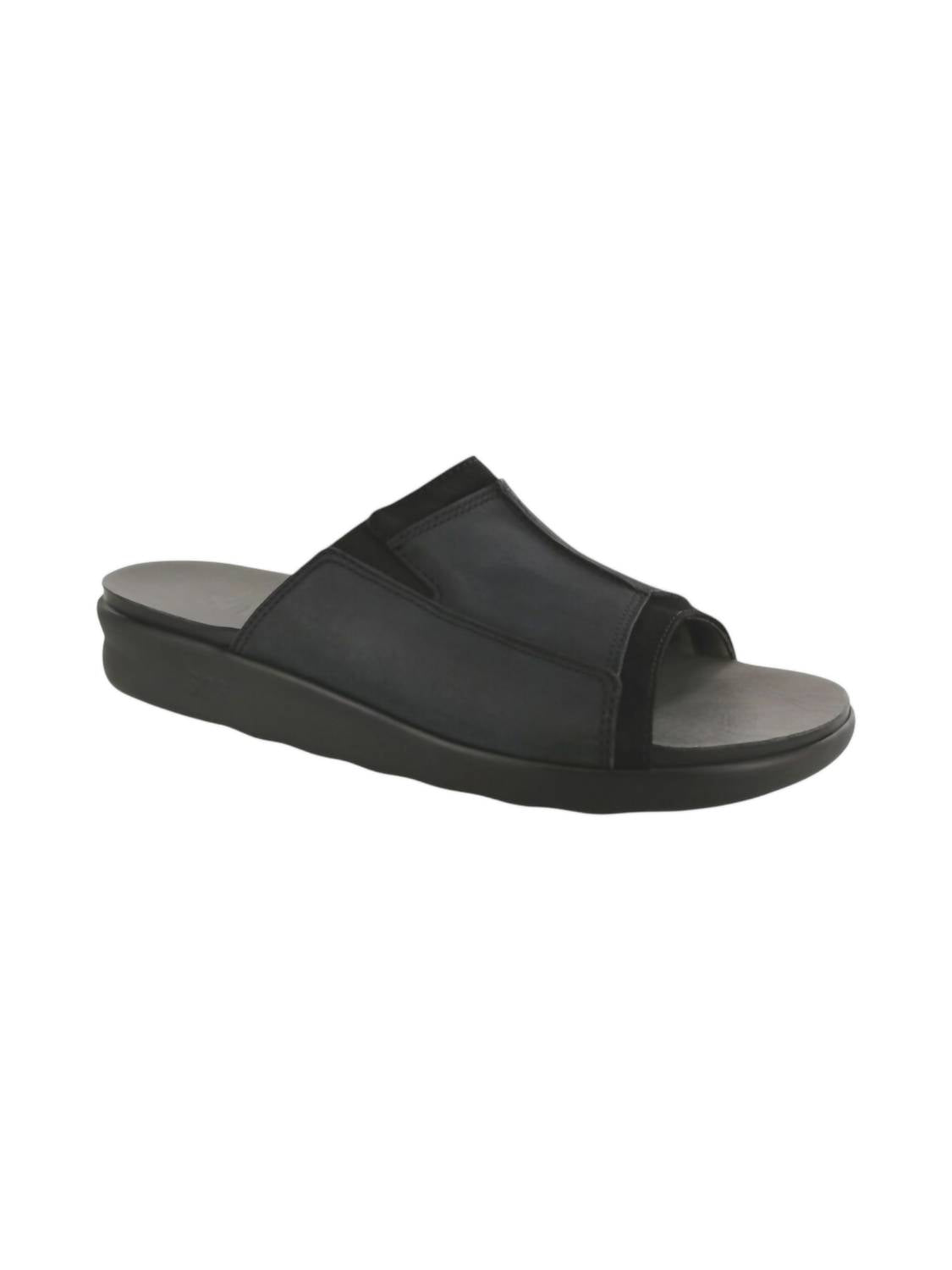 Introducing the Men's Voyage Slide Sandal by SAS, an essential for weekend adventures crafted in black waxed nubuck leather with a supple microsuede lining for unparalleled comfort. Designed with a 1.50" heel height, these sandals feature an open toe and a stretch gore for flexibility with every step. The contoured, molded insole and full-length leather socklining provide natural support and antimicrobial breathability, while the shock-absorbing sole ensures stability. Perfect for adults seeking style and comfort, these sandals cater to your every stride.