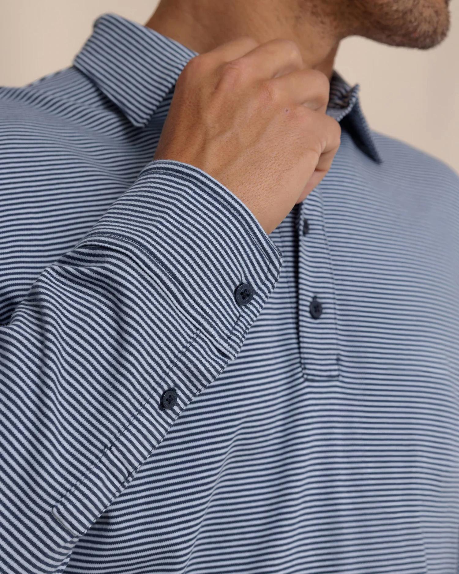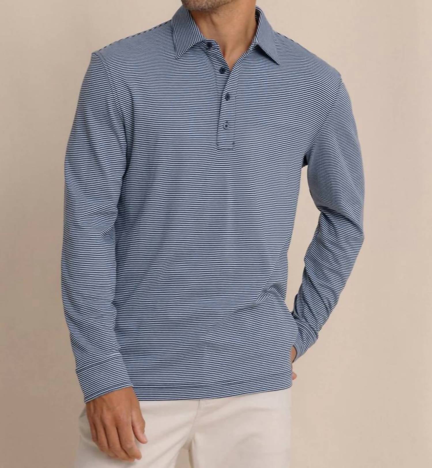 Introducing the Sandy Kay Sportshirt Long Sleeve Polo by Southern Tide, a perfect fusion of comfort and timeless style. Crafted from 100% cotton, this Sandstone Khaki pinstripe polo offers a breathable and soft feel. It features long sleeves and a self-collar with stays, complemented by solid grosgrain ribbon back neck tape for added detail. Closure: Button closure. Care instructions: Hand wash and line dry. Model is 6'1" wearing a size medium, ideal for versatile styling from casual office days to weekend outings.