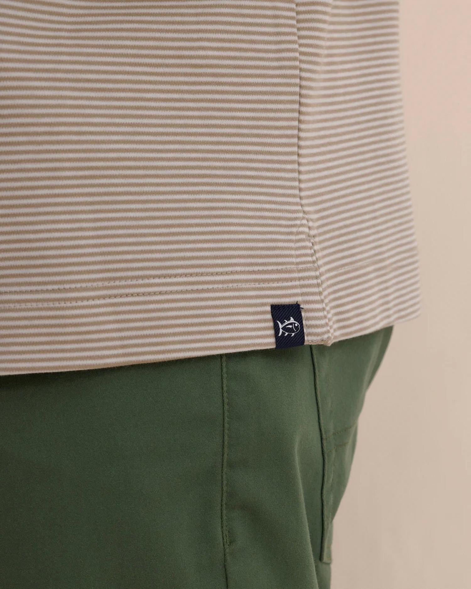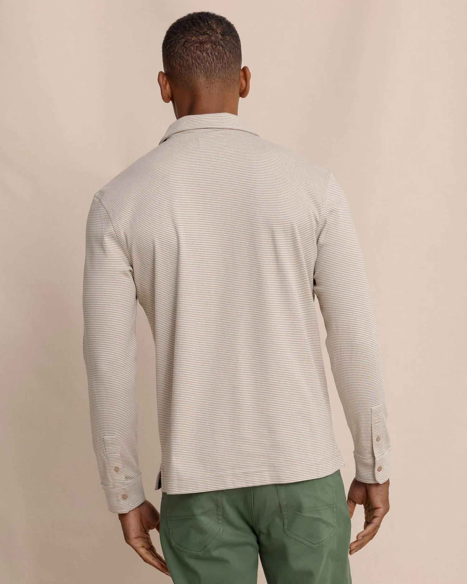 Introducing the Sandy Kay Sportshirt Long Sleeve Polo by Southern Tide, a perfect fusion of comfort and timeless style. Crafted from 100% cotton, this Sandstone Khaki pinstripe polo offers a breathable and soft feel. It features long sleeves and a self-collar with stays, complemented by solid grosgrain ribbon back neck tape for added detail. Closure: Button closure. Care instructions: Hand wash and line dry. Model is 6'1" wearing a size medium, ideal for versatile styling from casual office days to weekend outings.