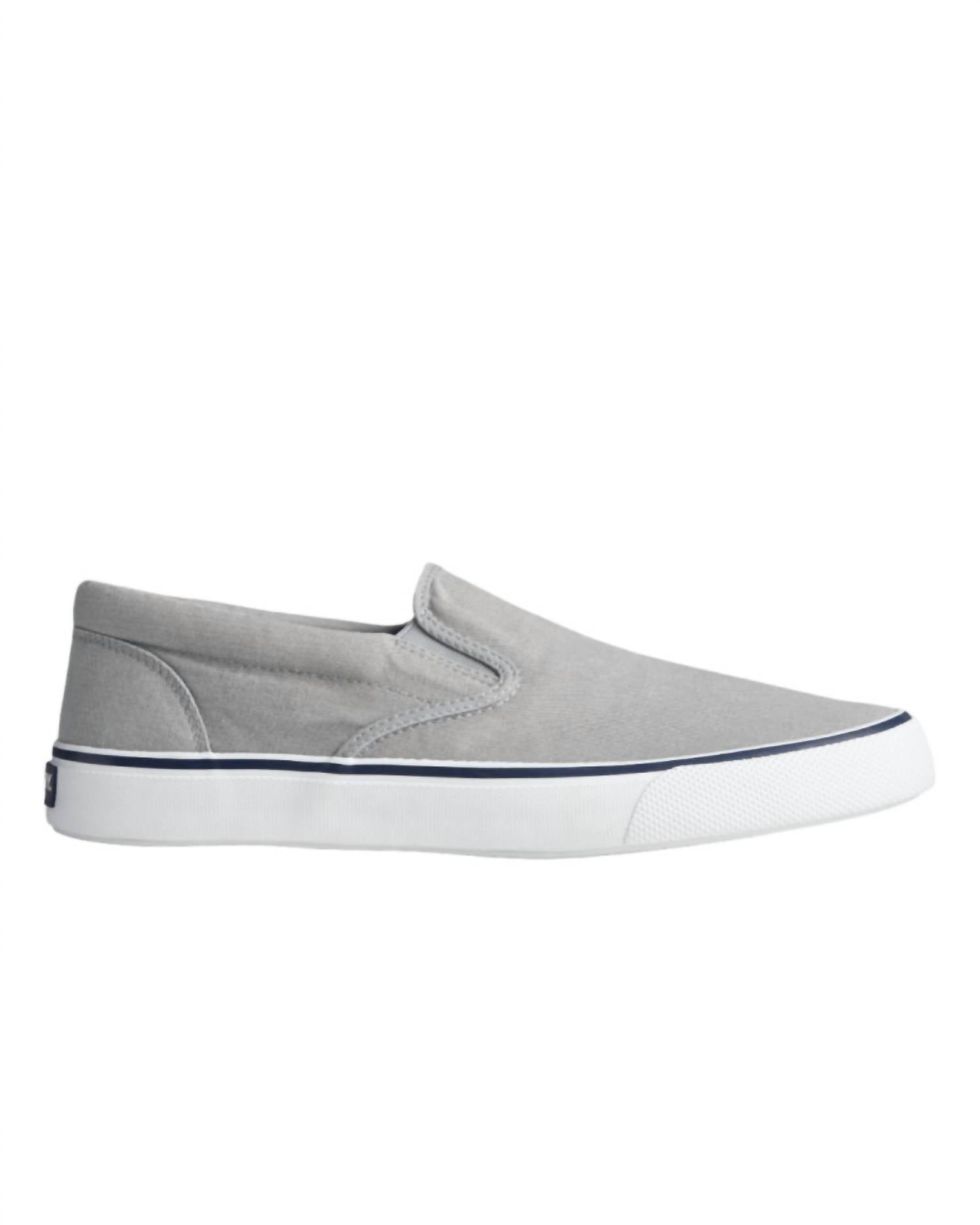 Discover the Men's Striper II Slip-On Sneaker by Sperry, a stylish addition to any collection with its minimalist streetwear appeal. These grey sneakers boast a relaxed salt-washed twill upper and a convenient twin gore construction for easy on/off wear. The round toe design and flat heel make them a comfortable choice, while the molded Wave-Siping technology enhances traction. These sneakers are perfect for springtime engagements and Easter celebrations.