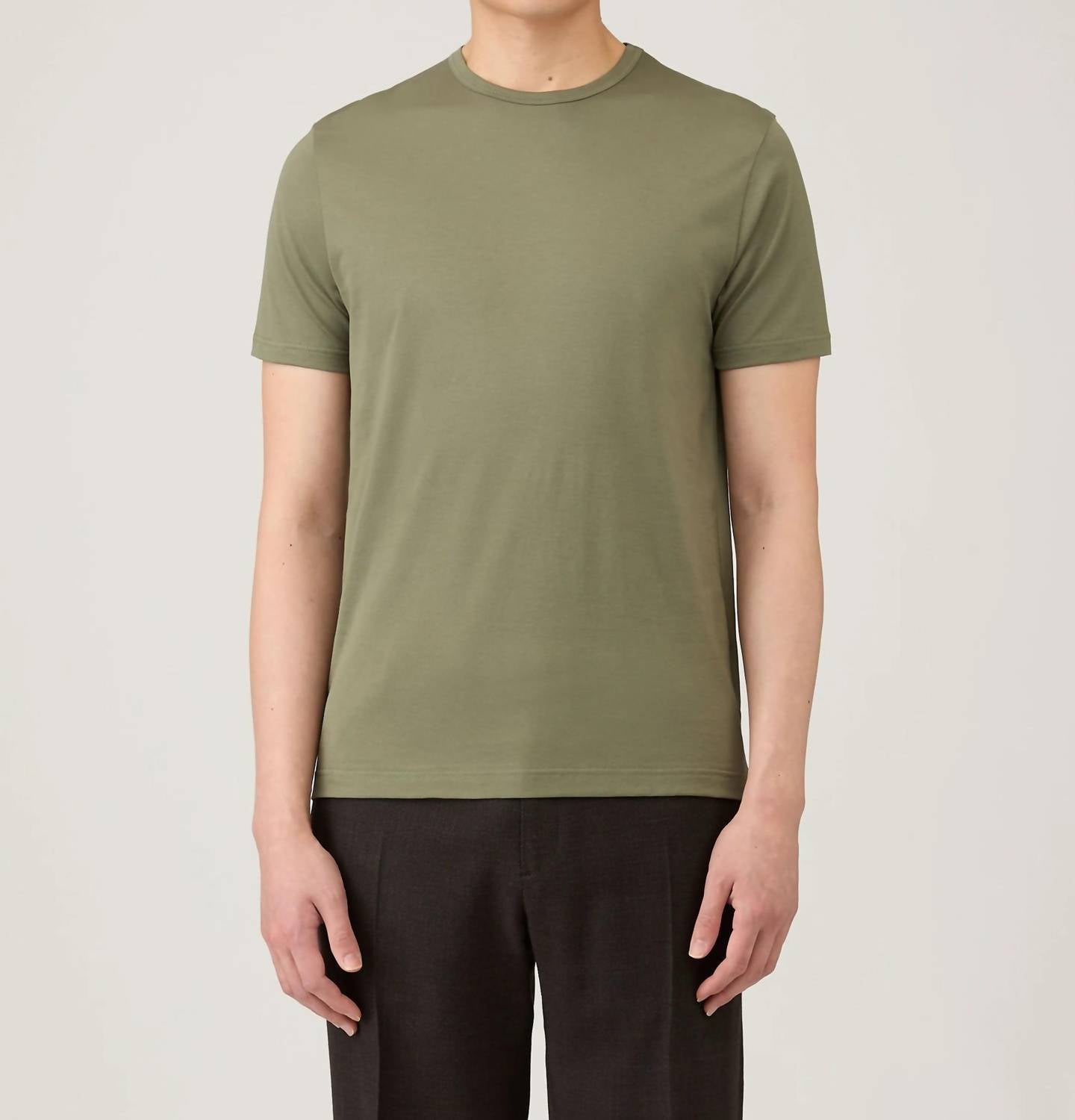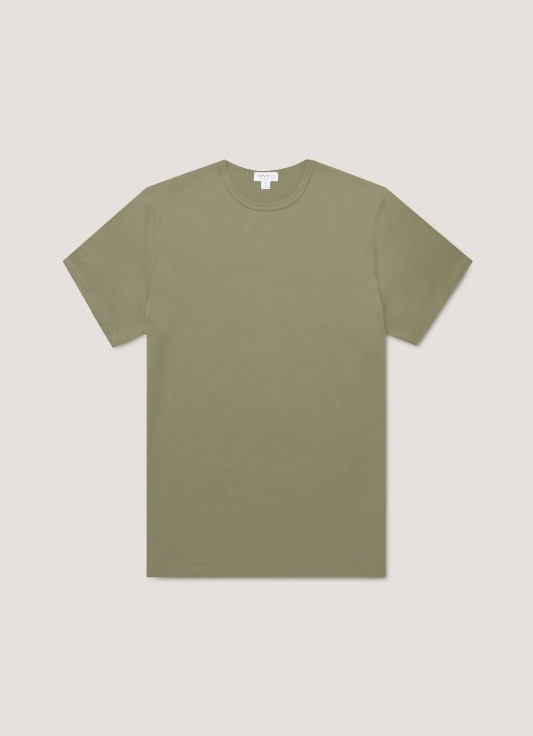 Introducing the Classic T-shirt by Sunspel, a timeless piece handcrafted in Long Eaton, England. This short sleeve tee in Sea Moss is made from premium Supima cotton, renowned for its lightweight and durable qualities. The solid pattern and crewneck design contribute to its stylish simplicity, with a pull-on closure ensuring effortless wear. Perfect for summer vacations, it offers a slim fit essential for every wardrobe.