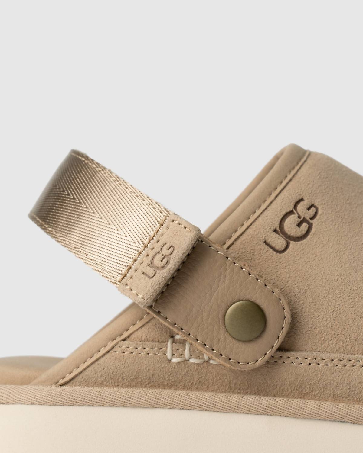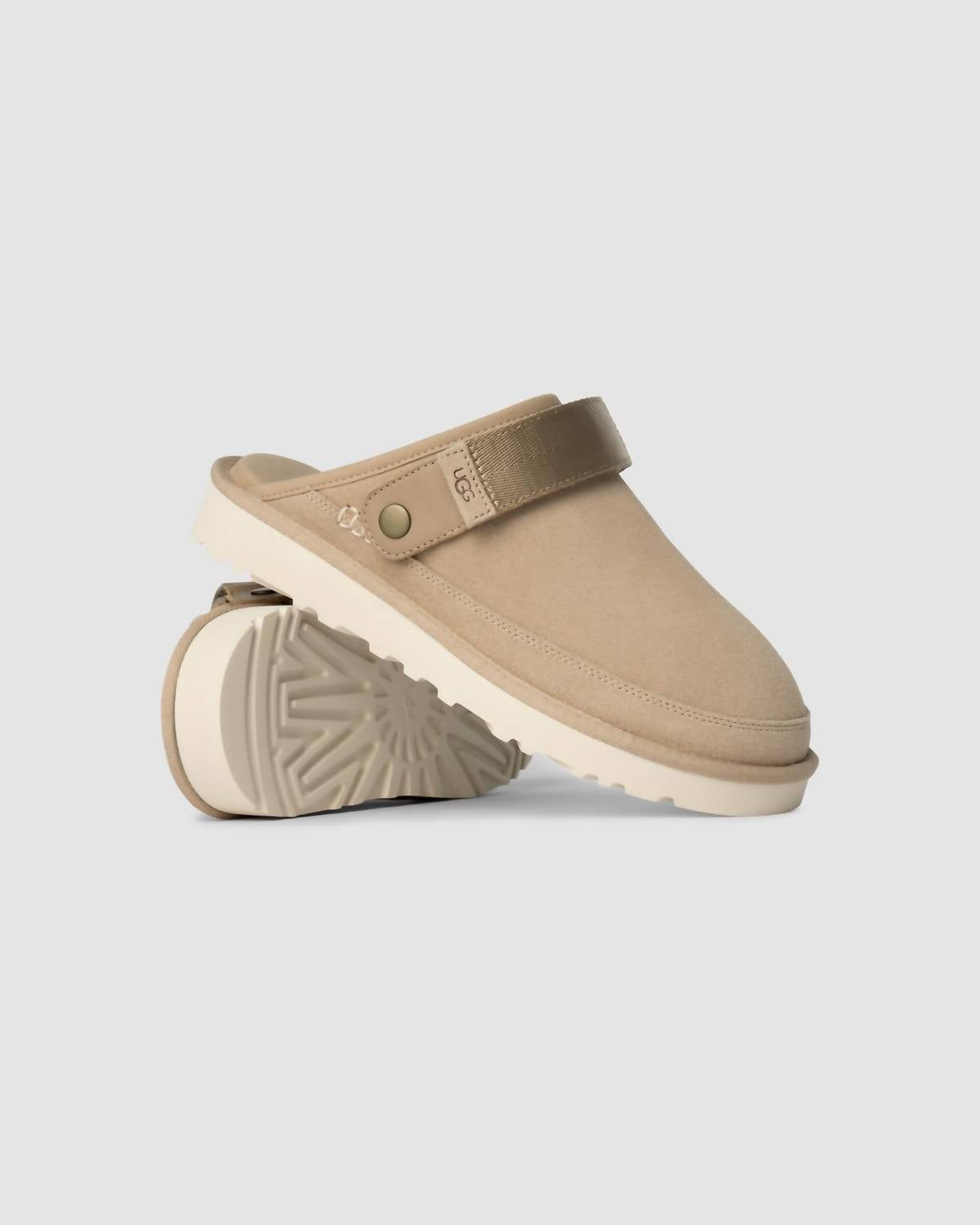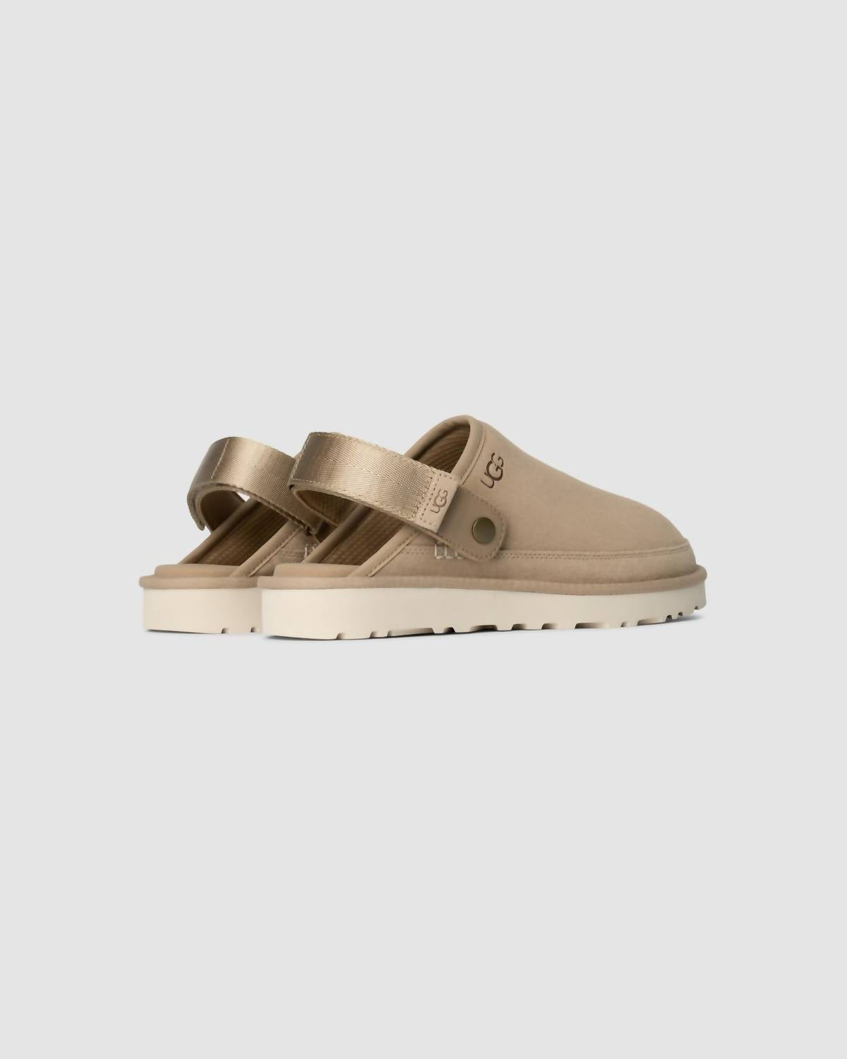 Step into comfort with the Men's Goldencoast Clog II by UGG, a perfect companion for your spring travel adventures. Featuring an adjustable heel strap with a convenient hook-and-loop closure, this clog combines style with functionality. The sand-colored suede upper and metal hardware add a touch of sophistication, while the textile lining made from 100% recycled polyester and microfiber trim ensures sustainability. Its foam footbed and Sugarcane EVA outsole provide comfort and support, all accented by the iconic UGG® logo, heat-embossed with precision.